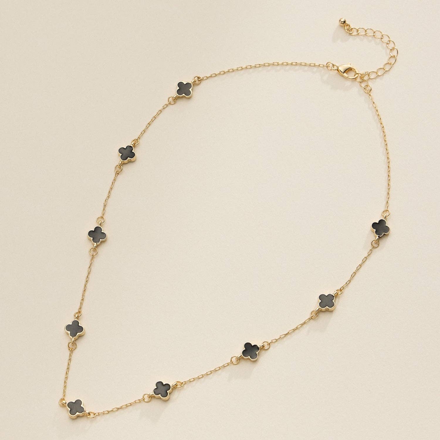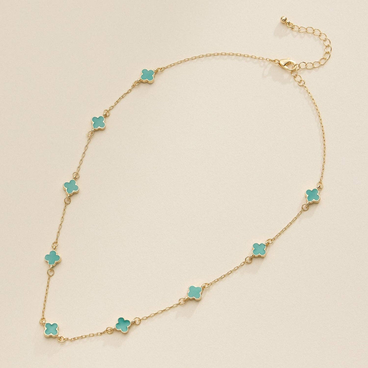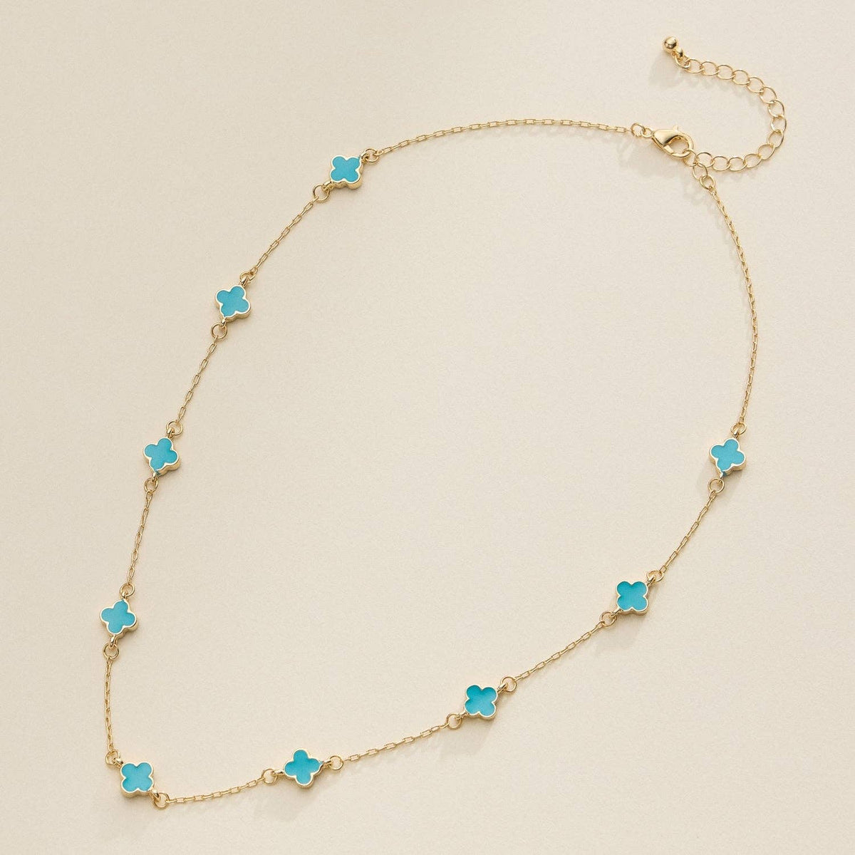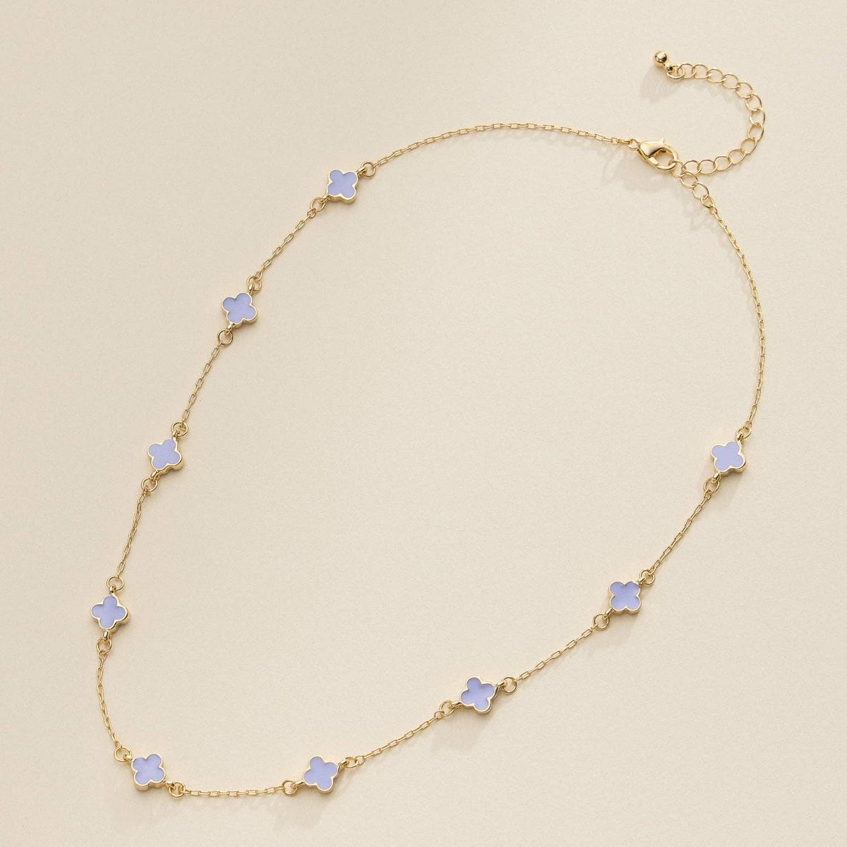 This gold charm necklace features delicate enamel accents for a stylish and minimalist look. Perfect for layering or wearing alone, it's an elegant addition to any jewelry collection. Length: 16" +2" 18K gold plated, made of Brass Enamel covered on metallic Clover charms