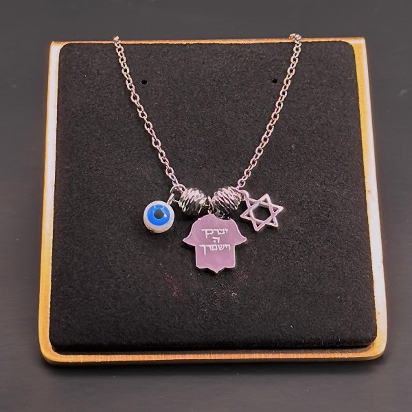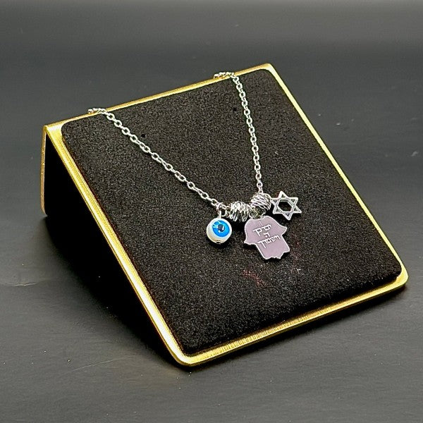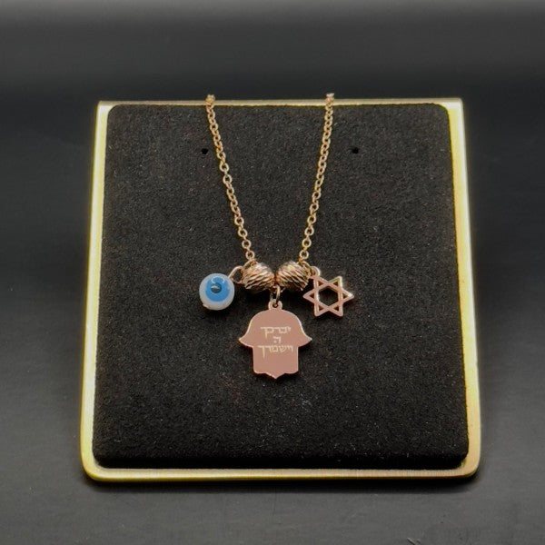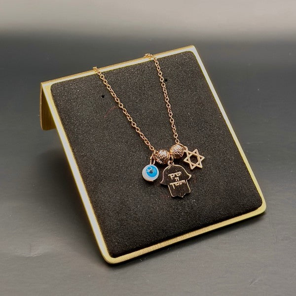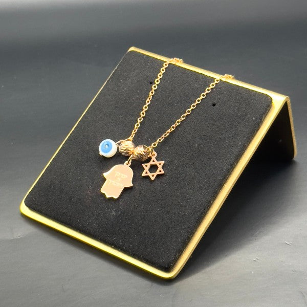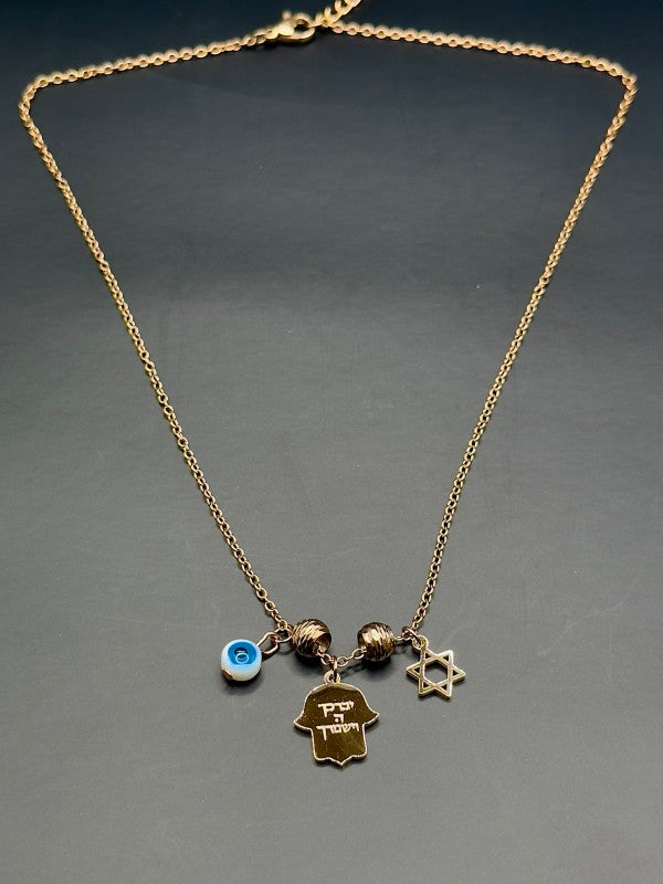 Elevate your accessory collection with this meaningful Hamsa necklace, featuring a trio of symbolic charms - a Hamsa hand, an Evil Eye, and a Star of David. This piece represents protection, positivity, and spiritual connection.