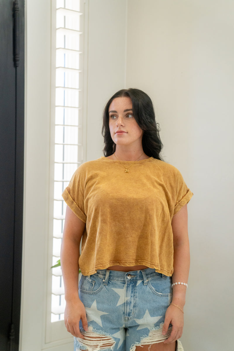 Acid Wash Cotton Folded Sleeve Top Zenana