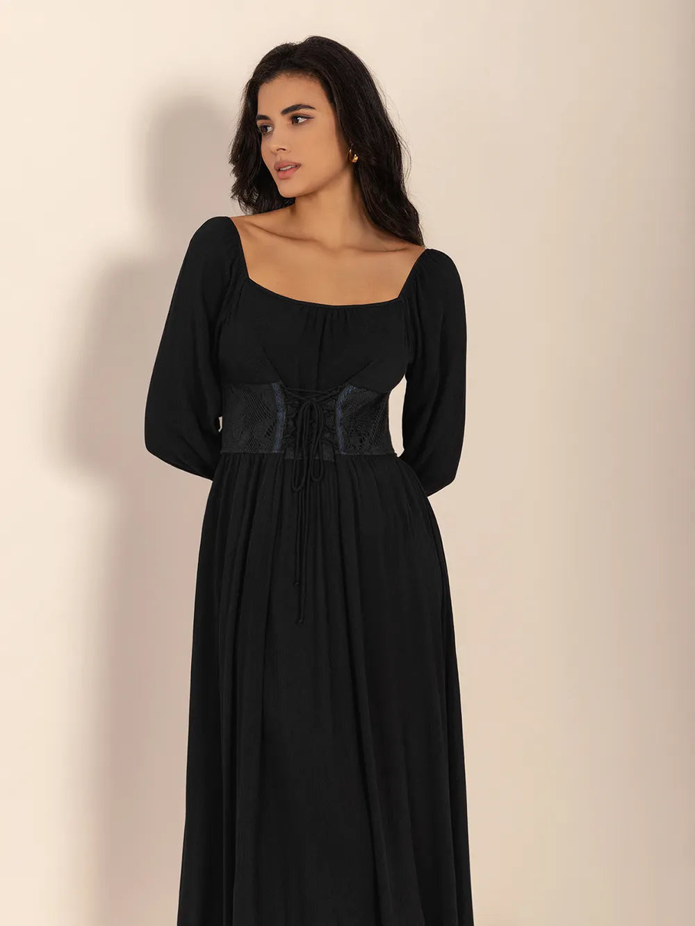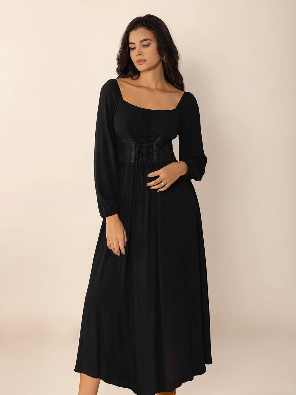 Lace-Up Square Neck Long Sleeve Midi Dress