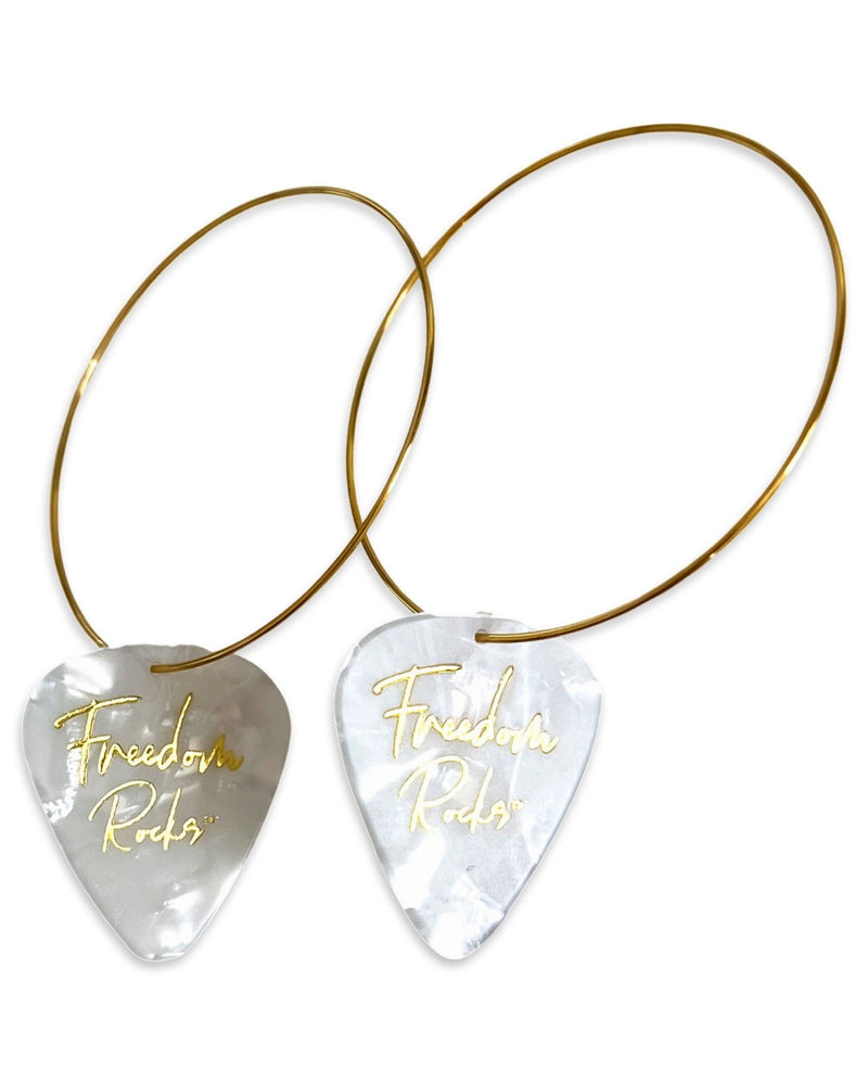 Freedom Rocks White Pearl Hoop Guitar Pick Earrings Groupie Love (50mm)