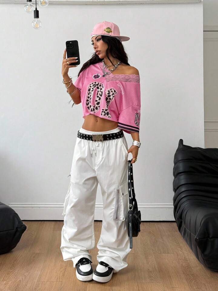 01 Leopard Pink Lace Mesh Trim Crop Top Jersey