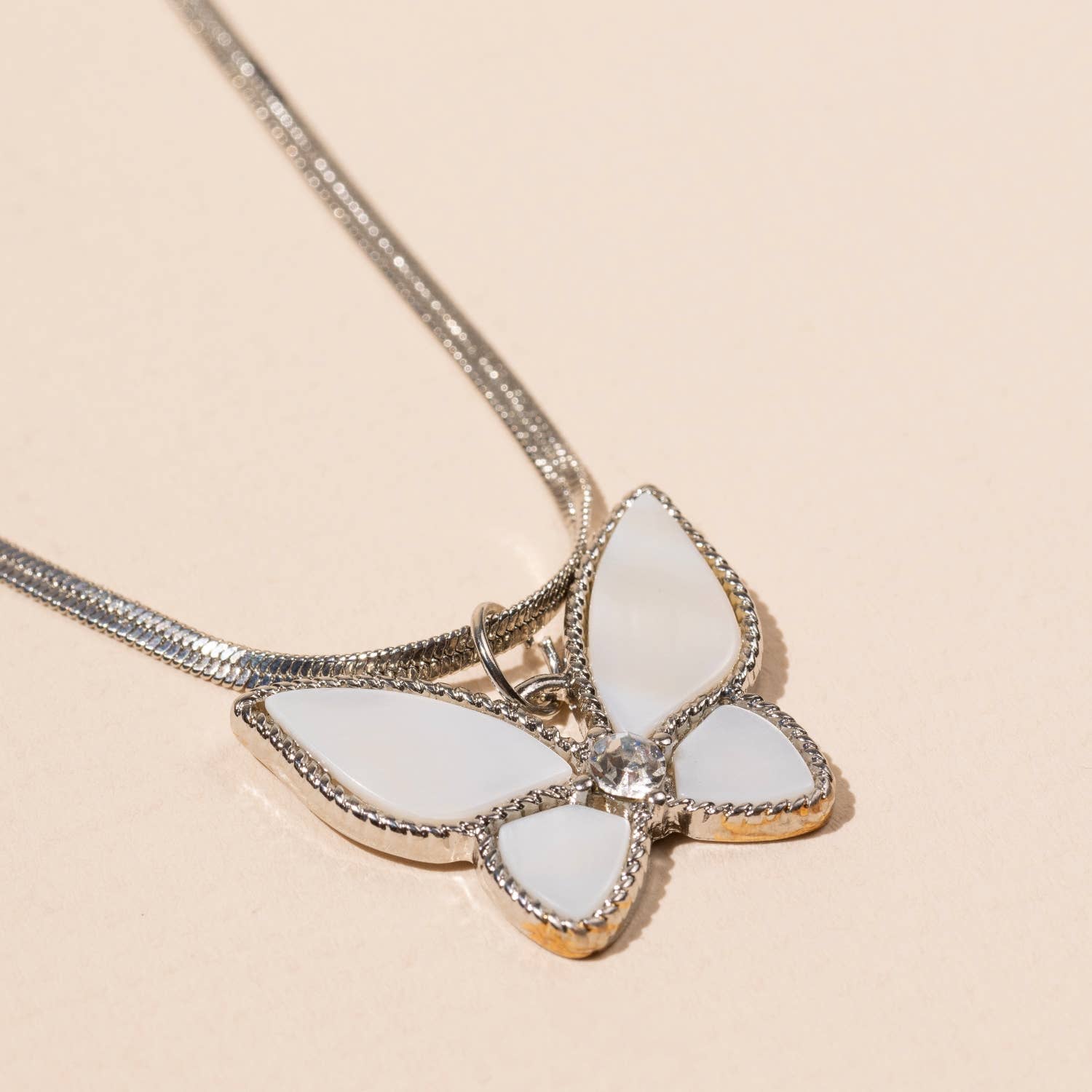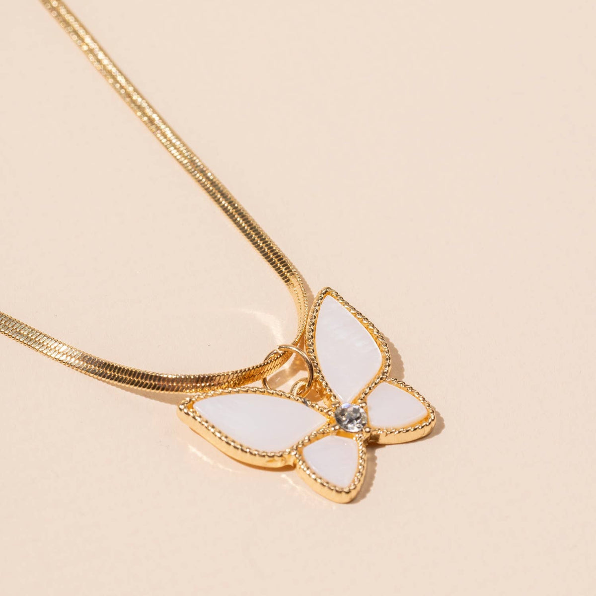 Fly away with this cute Butterfly Charm Short Necklace! This delicate necklace features MOP butterfly charm, adding a touch of charm and playfulness to any outfit. Bring a lovely and whimsical touch to your style with this adorable necklace.
