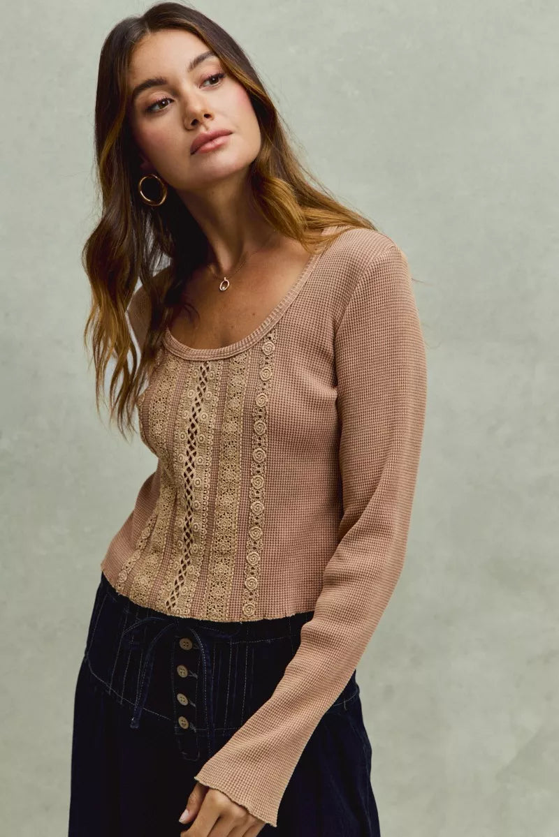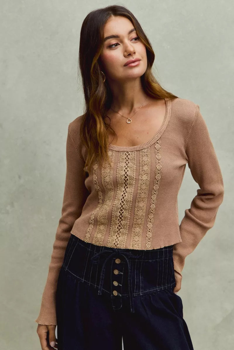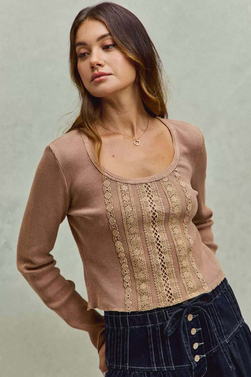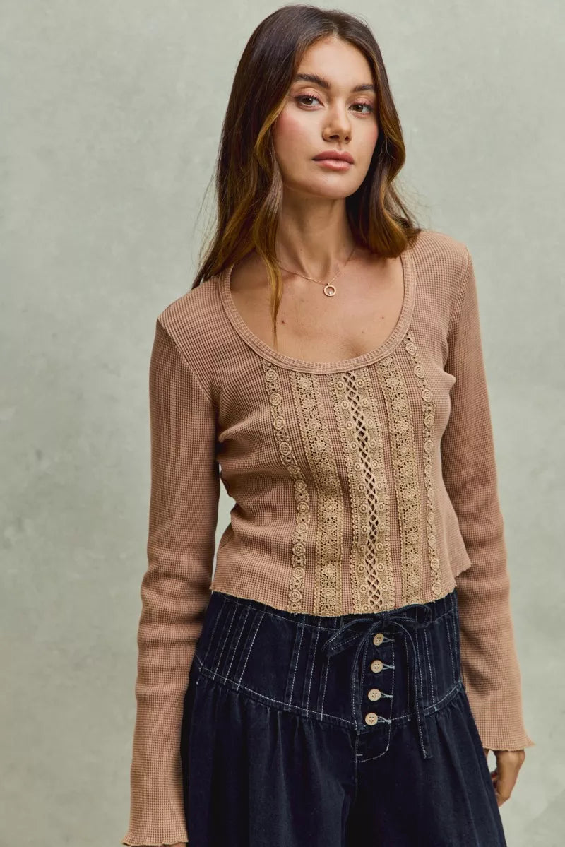 SO ME Vintage Washed Lace Crop Thermal Washed Knit Top