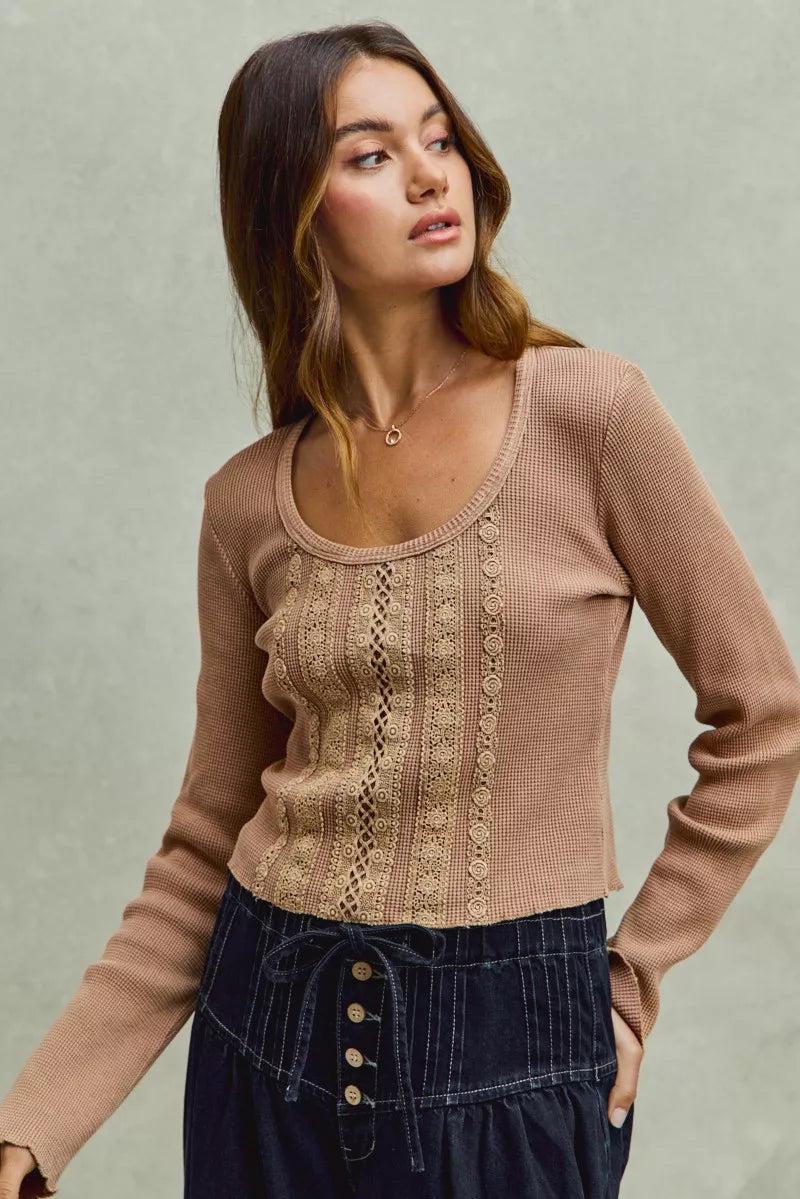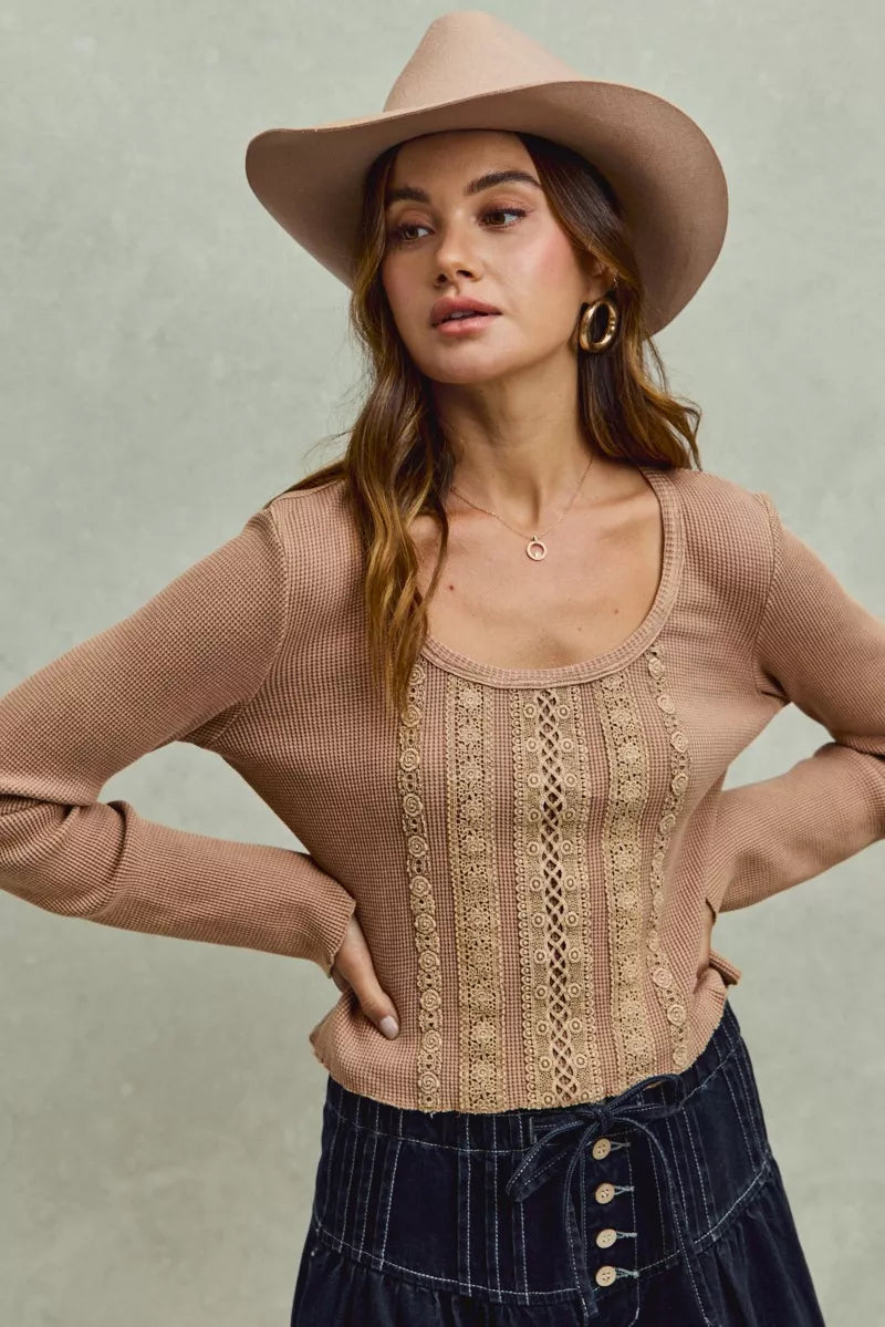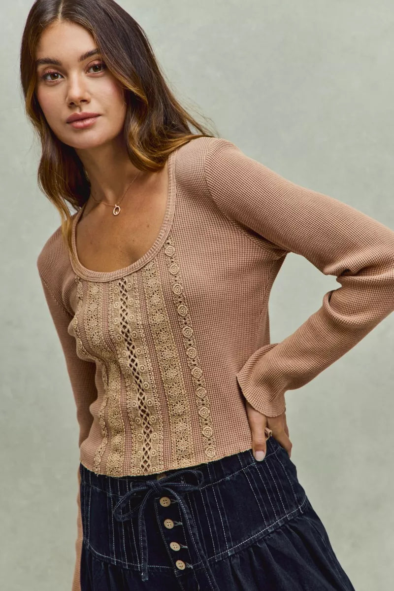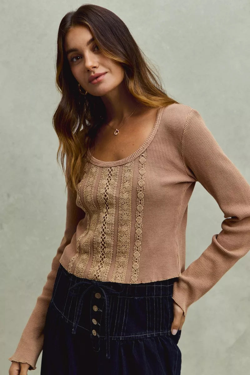 SO ME Vintage Washed Lace Crop Thermal Washed Knit Top