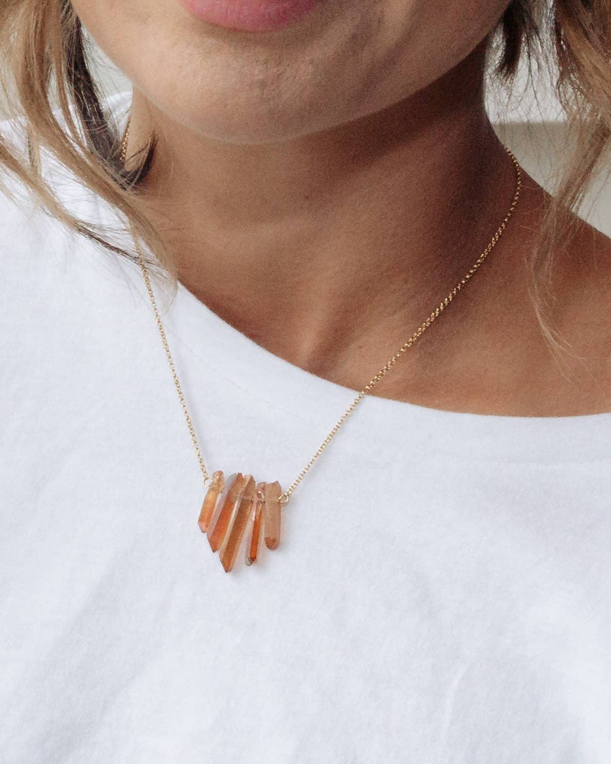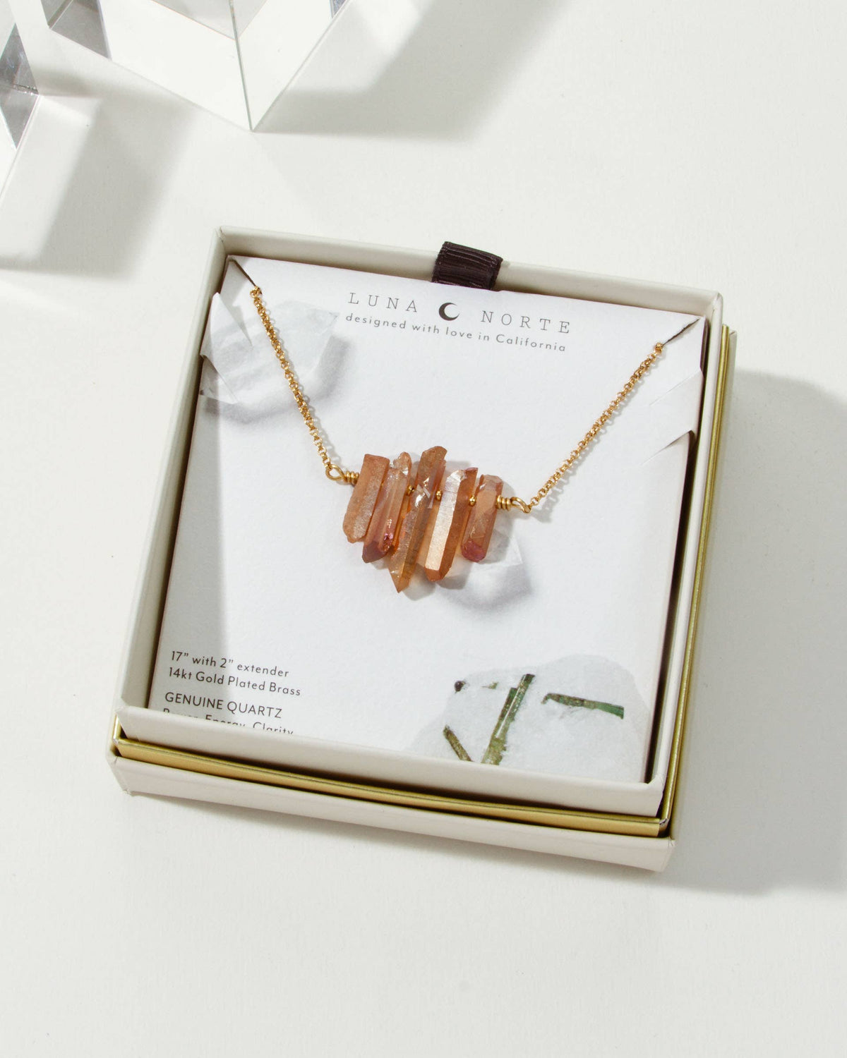 Quartz Power, Energy, Clarity Quartz can be used to purify and clarify the spiritual, mental, and physical planes, clearing away negative energy and increasing inspiration and creativity. Style Details: Genuine Quartz in Peach 14KT gold plated brass Chain Length: 17″ | Row of quartz: 1″  | 2″ extender chain (Each stone is unique. Size and shape may vary slightly) Handcrafted with love in the United States of America with imported materials.
