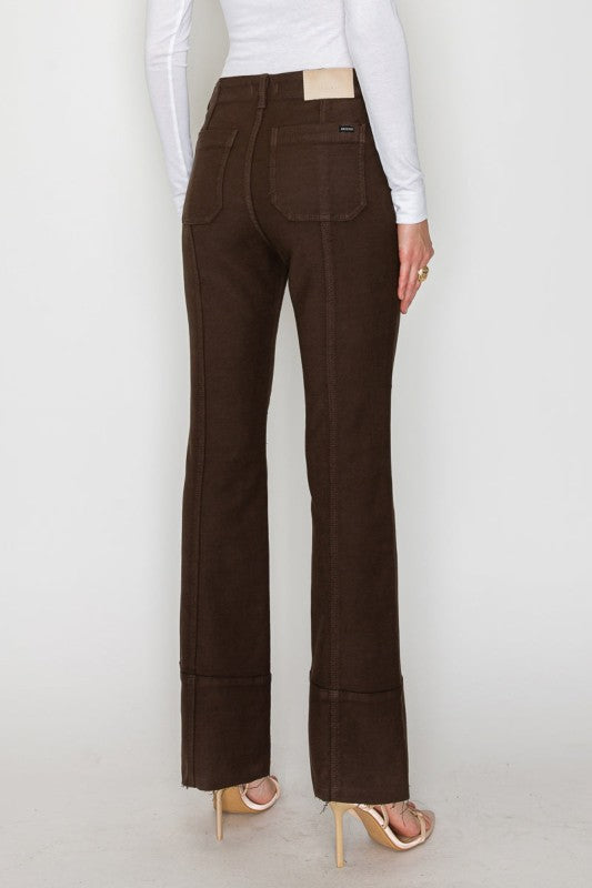 Elevate your wardrobe with our High Rise Bootcut Jeans, crafted in a rich brown wash that adds warmth and sophistication to any look. Designed with front patch pockets, vertical seam detailing, and a clean bootcut leg, this style offers a flattering, lengthened silhouette. The premium PFD-034 stretch fabric provides everyday comfort while maintaining a structured and polished fit. Finished with a modern raw hem, these jeans blend classic design with contemporary edge.