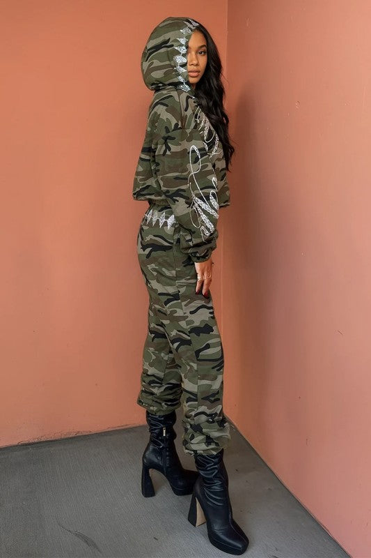 Command attention in this bold camouflage or black two-piece set. Designed for the confident trendsetter, this set features a zip-up jacket adorned with sparkling rhinestone accents for a striking blend of rugged and glam. The high-waisted jogger pants come with a comfortable elastic waistband, ensuring a perfect fit that flatters every curve.