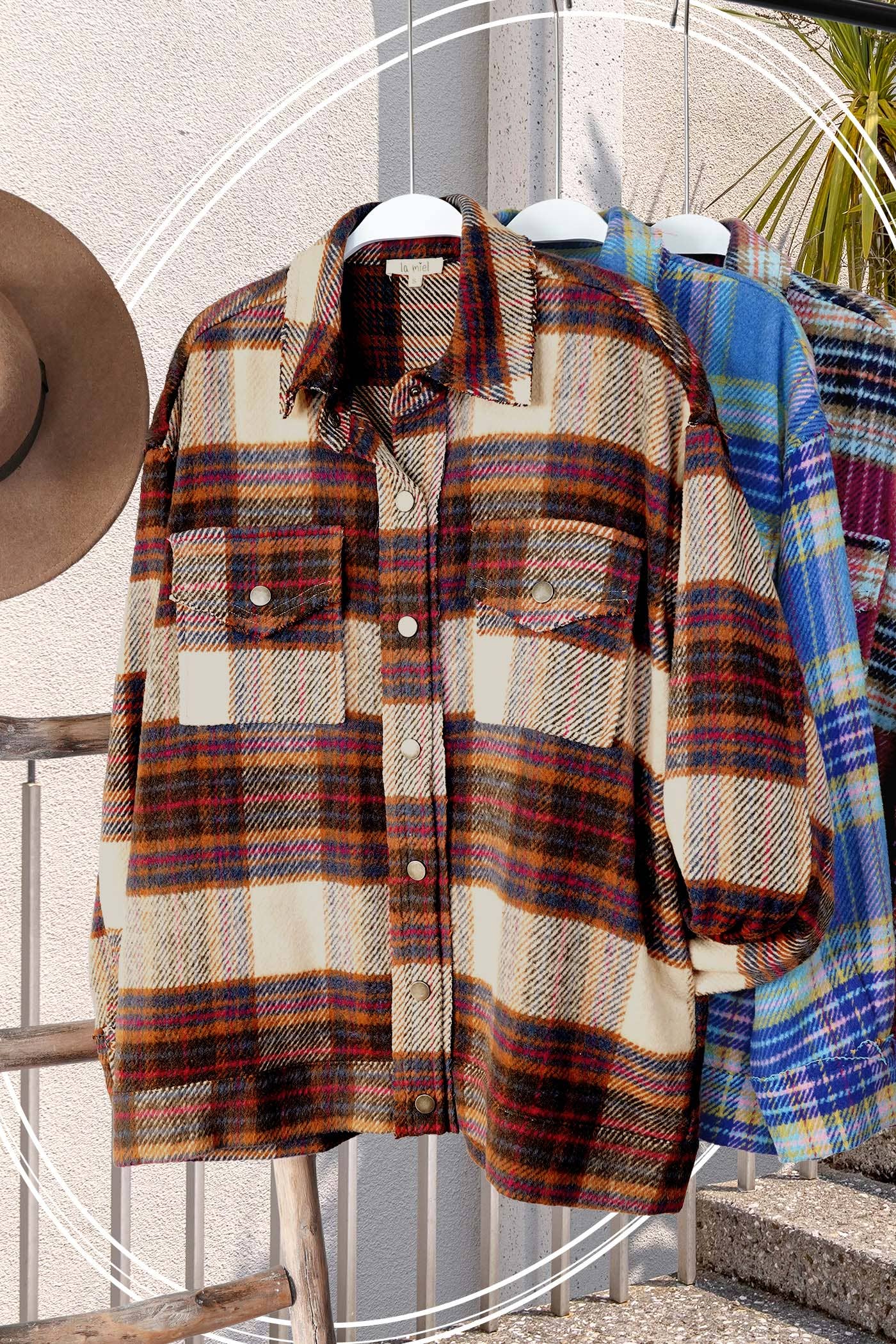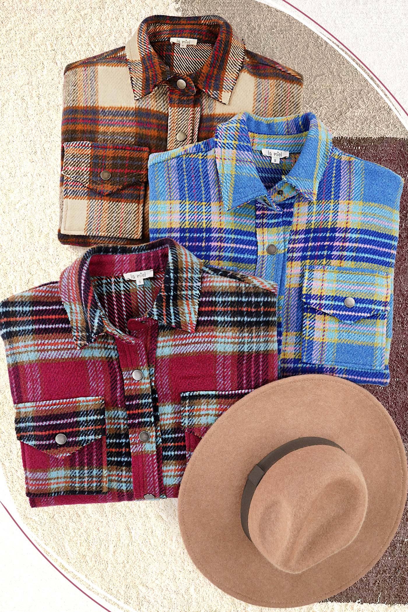 plaid jacket, shacket, loose fit, layering piece, side pockets, chest pockets, slouchy fit, snap button closure, cut edge detail, fall, Christmas shacket, holiday outer