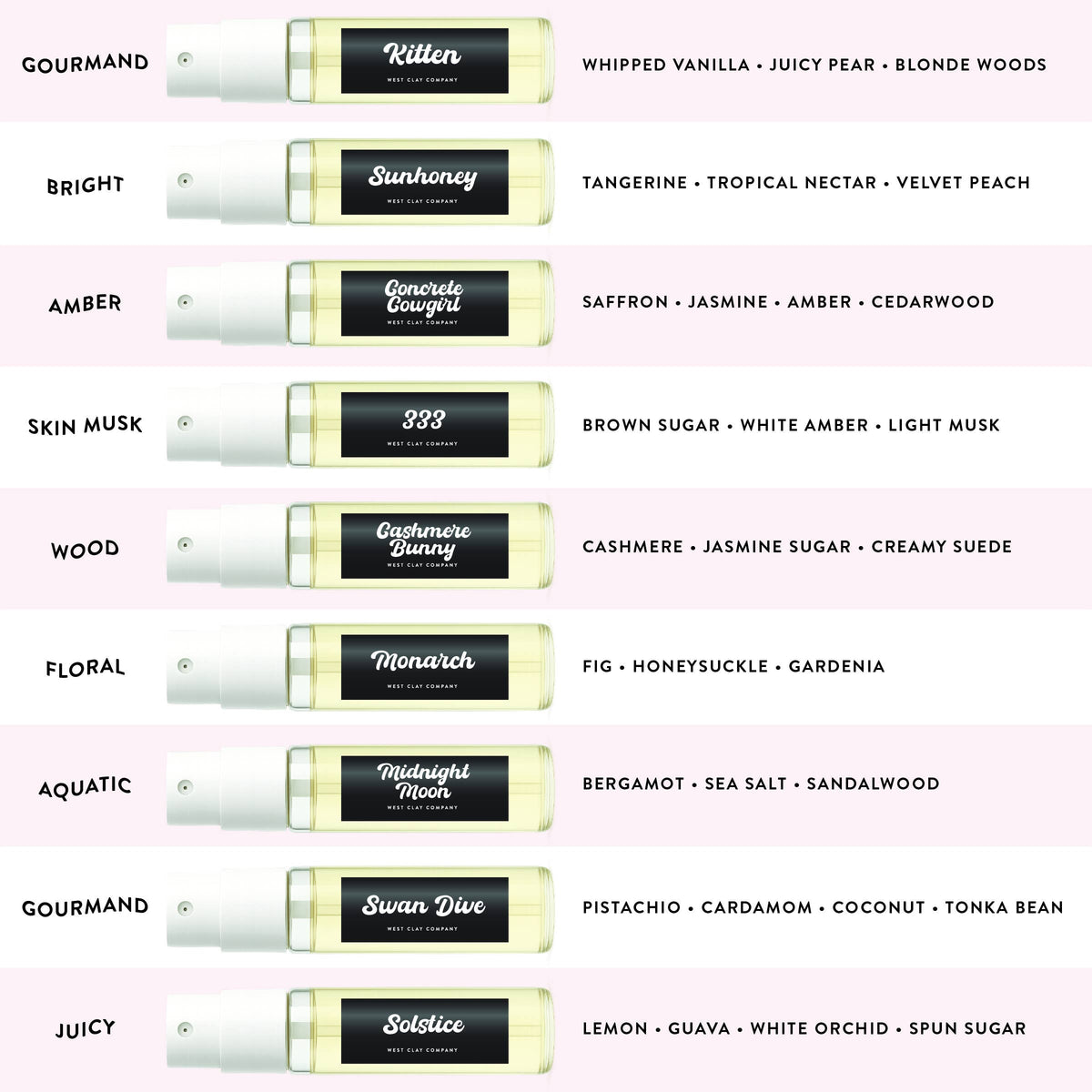 333 • Cashmere Bunny • Kitten • Solstice • Monarch • Sunhoney • Concrete Cowgirl • Midnight Moon • Swan Dive