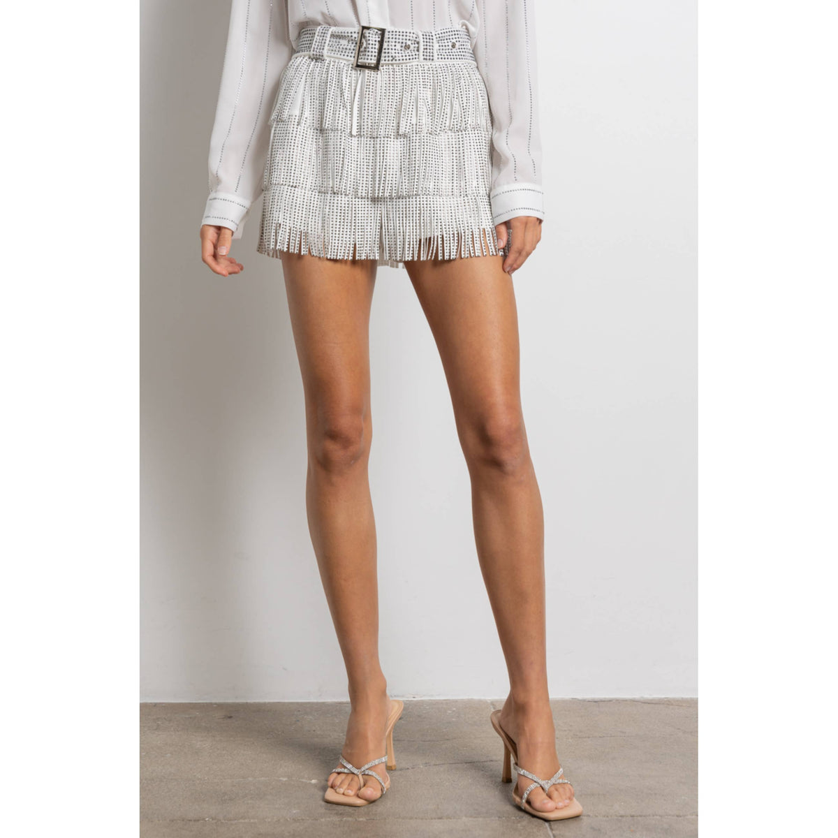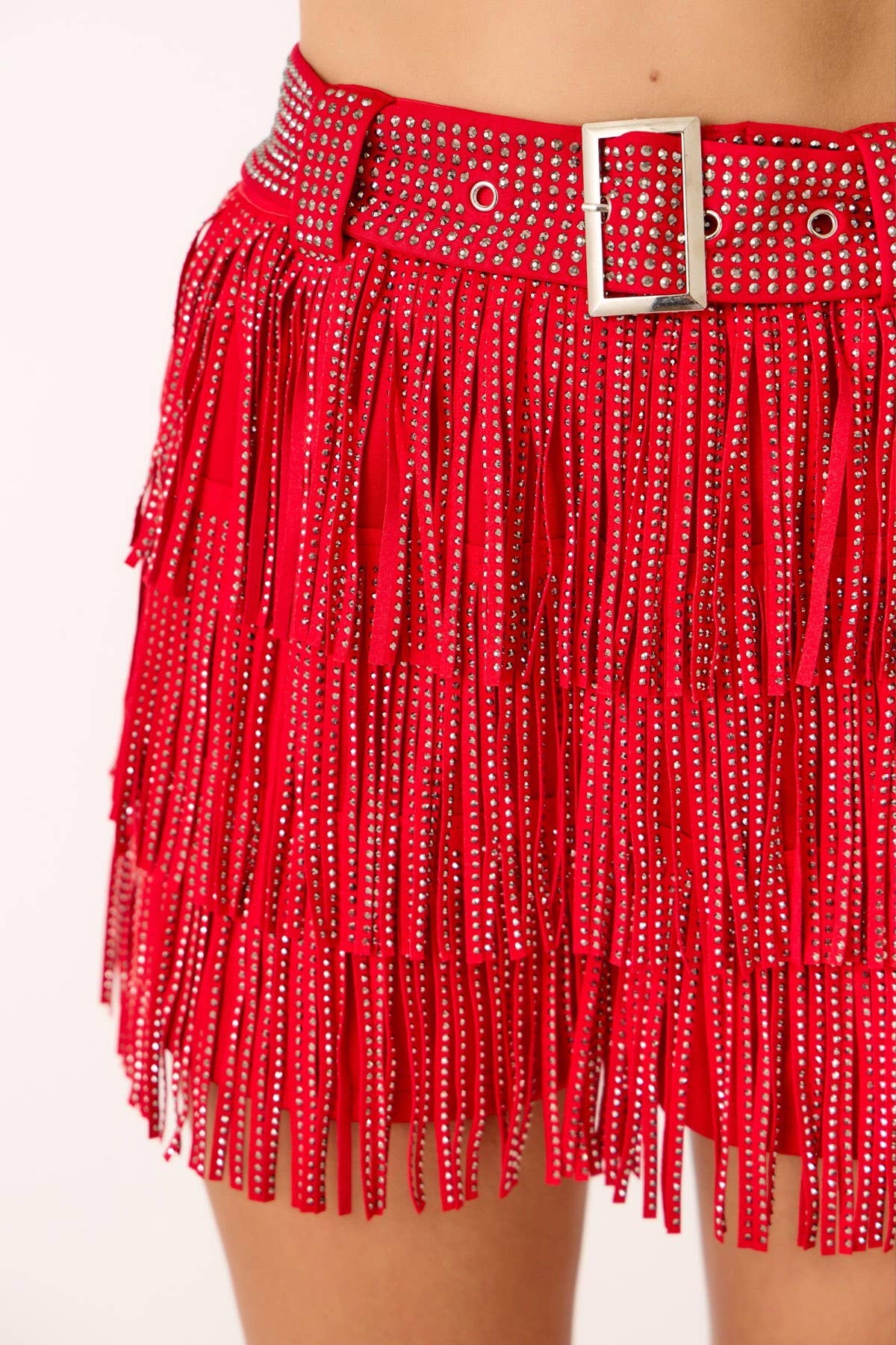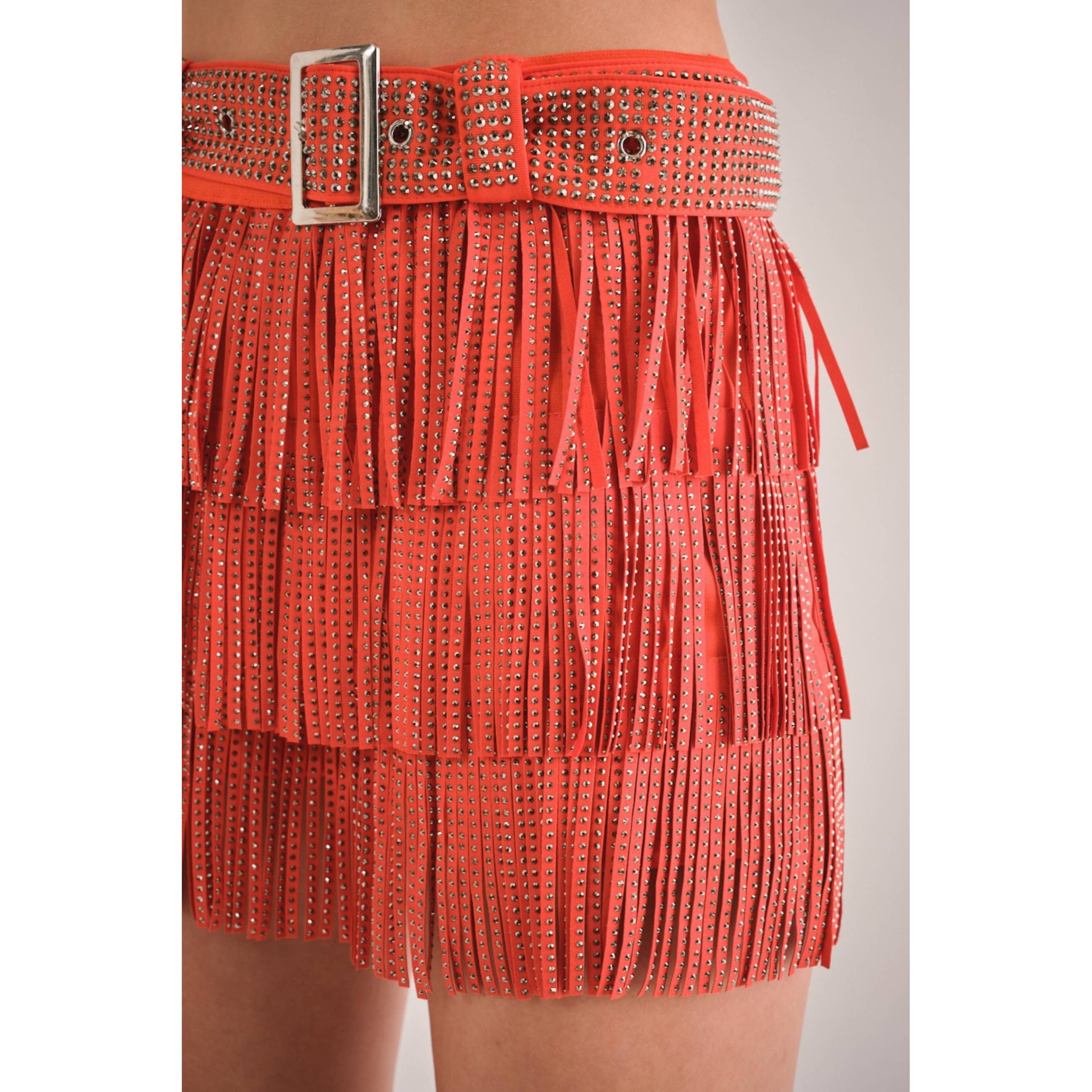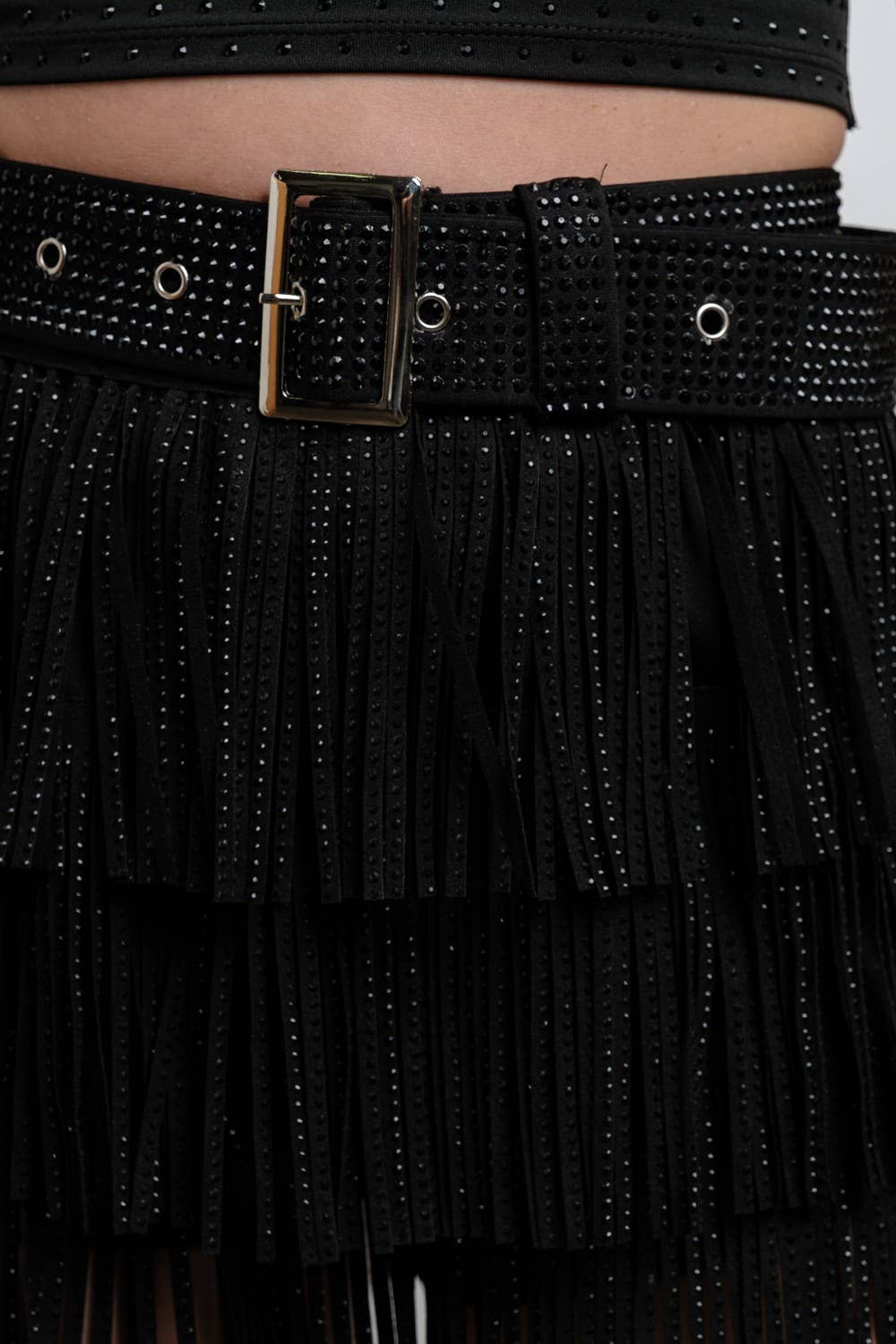 Fringe tassel skort (shorts underneath) Embellished with gunmetal hotfix rhinestones Elastic waist Comes with embellished belt Model is 5'8; wearing a size Small 32-24-34