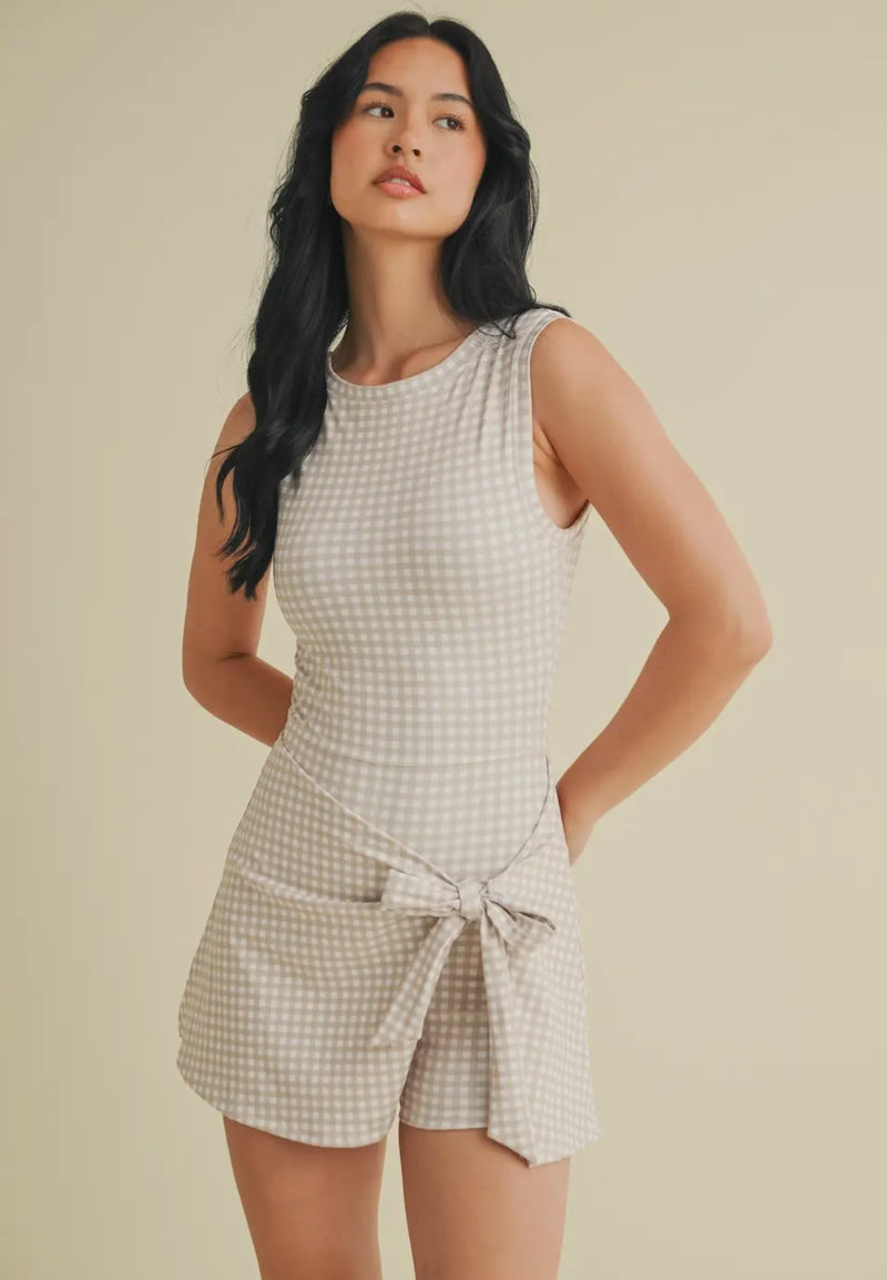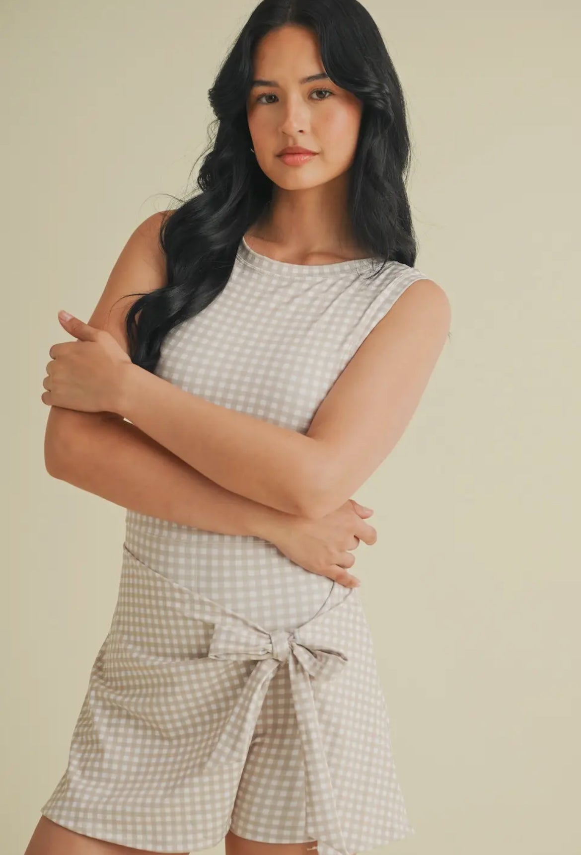 Gingham Beige Print Sleeveless Wrap Tie Front Dress by Kimberly C