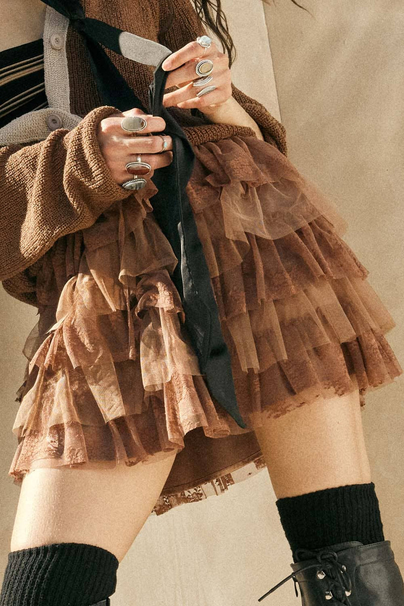 Brown Lace and Tulle Tiered Ruffle Mini Skirt by Promesa