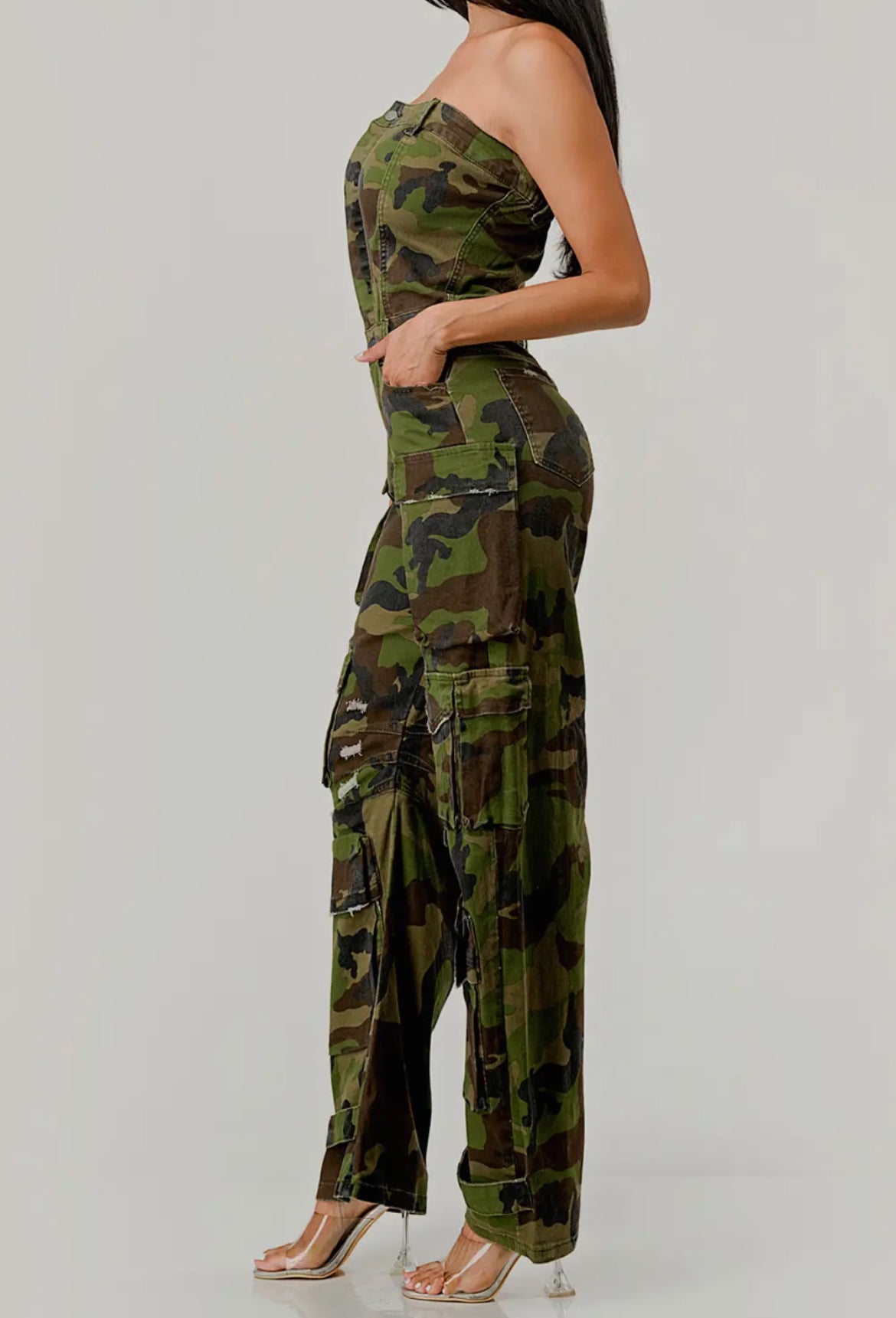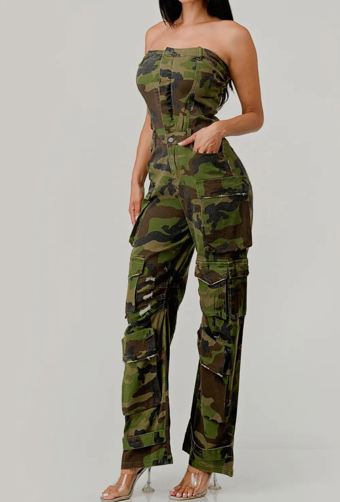 This strapless jumpsuit features a camouflage print and cargo-style pockets. Perfect for any casual or outdoor occasion, it offers both style and functionality. The strapless design adds a touch of femininity, while the cargo pockets provide practical storage space.