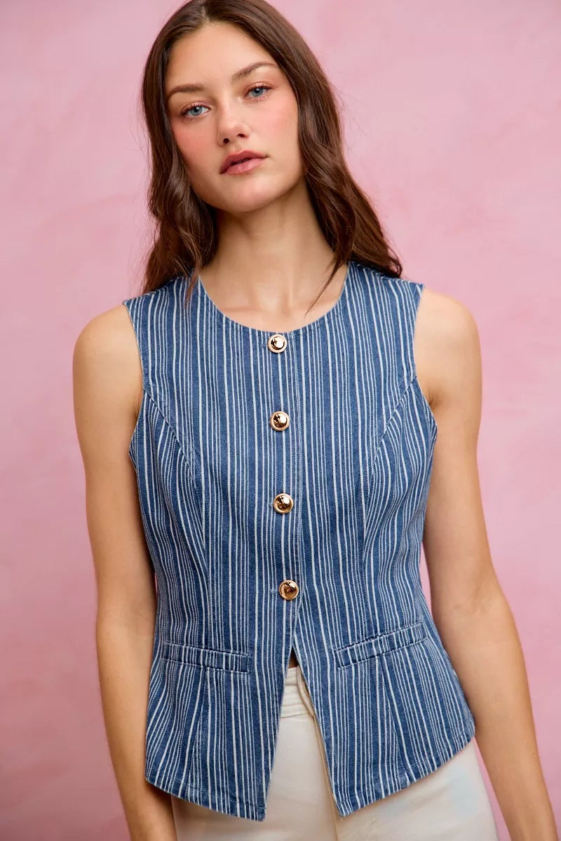 SO ME Stripe Slim Fit Button Front Denim Vest Top