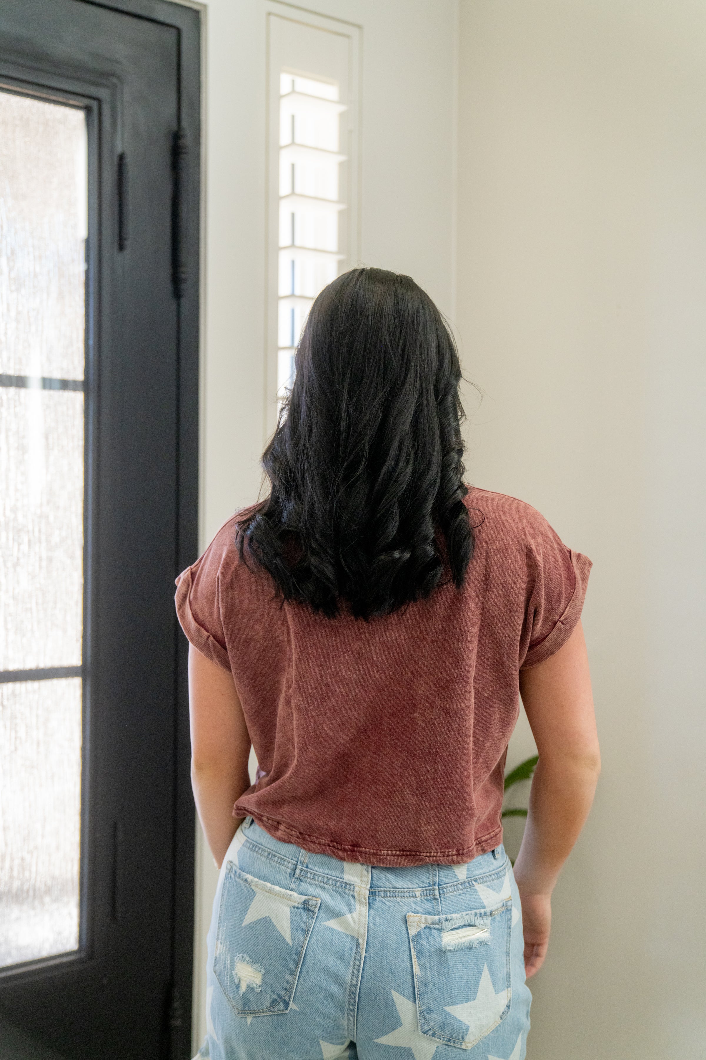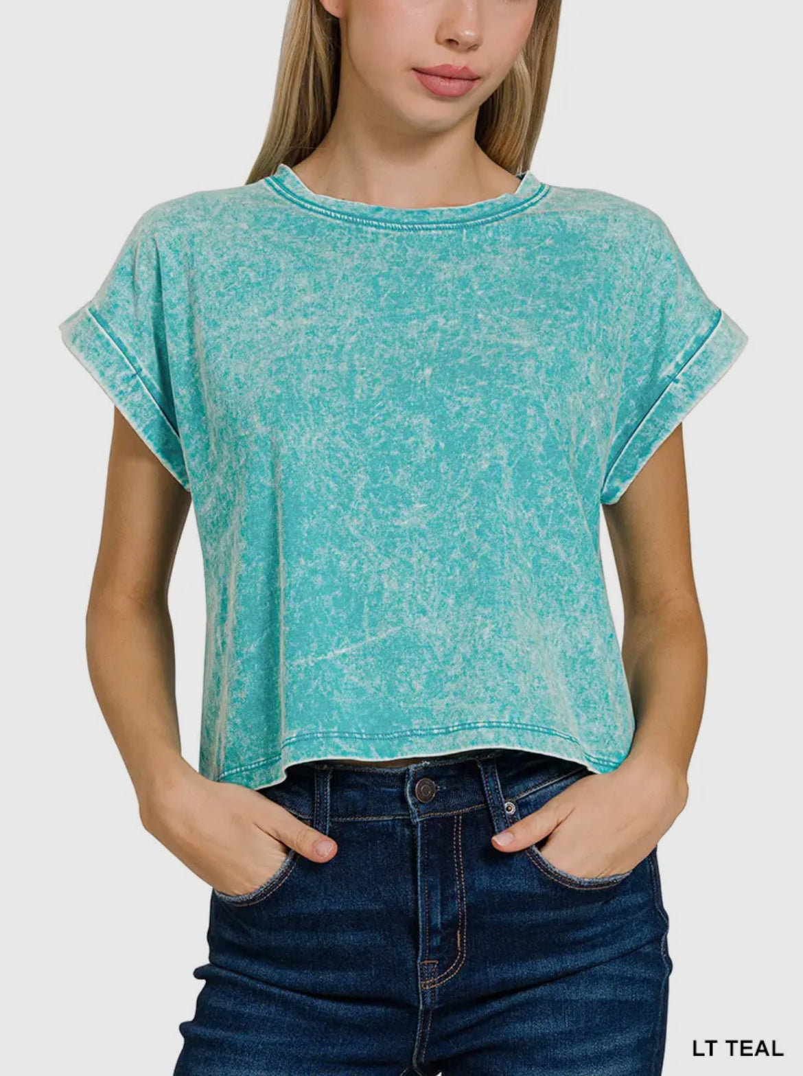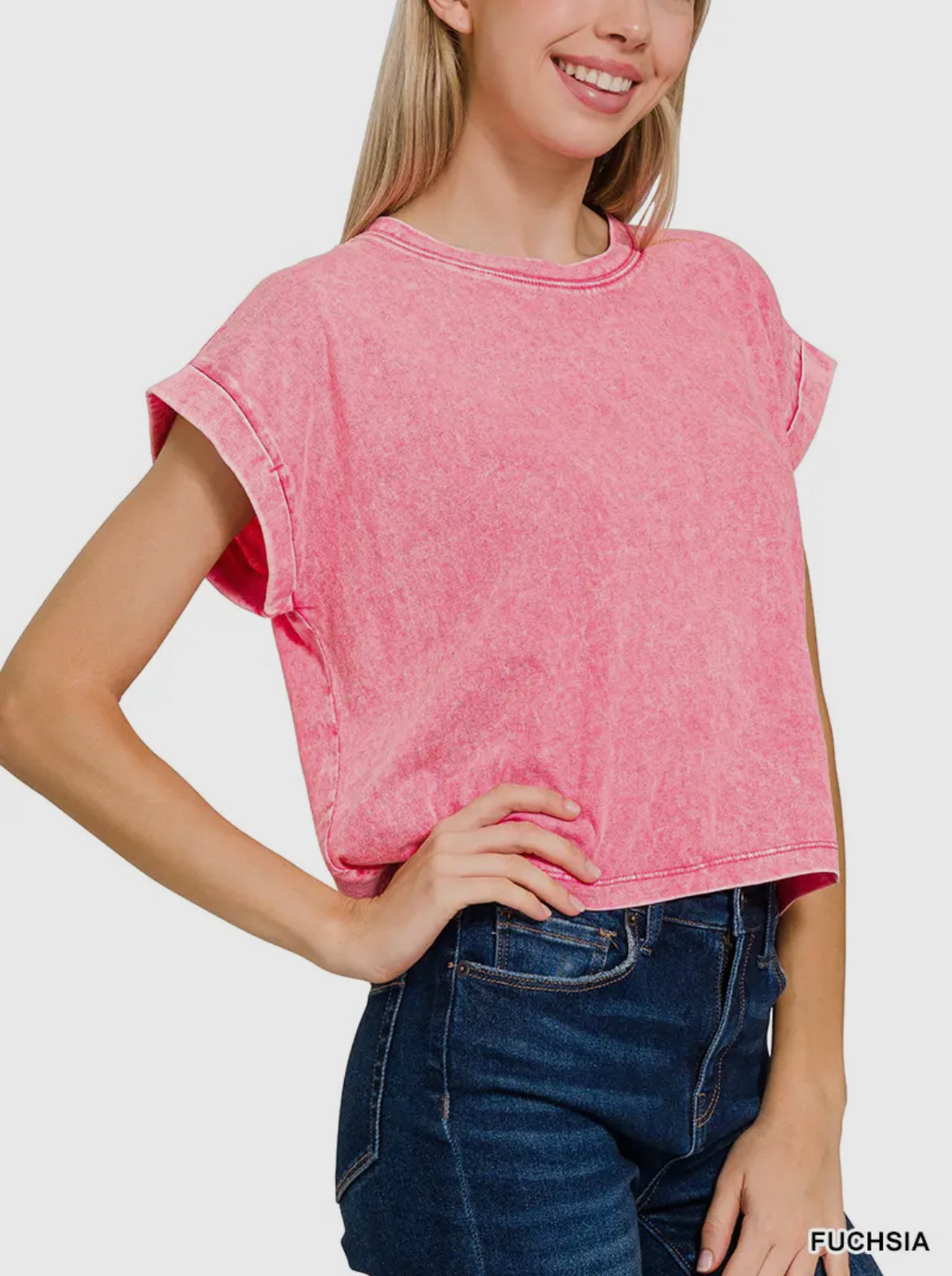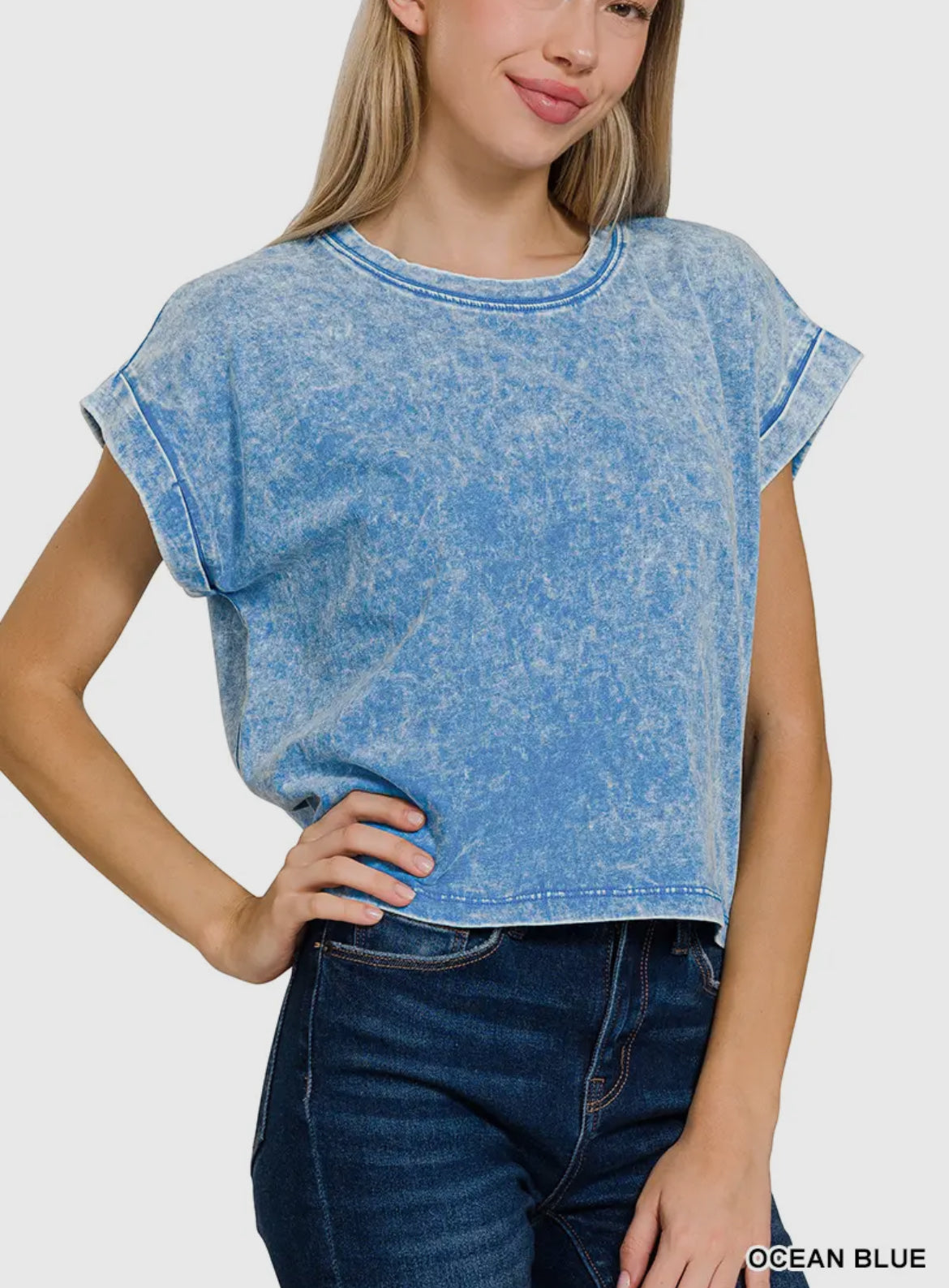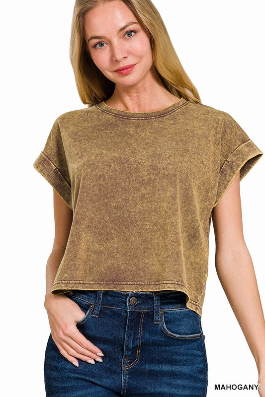 Acid Wash Cotton Folded Sleeve Top Zenana Mocha