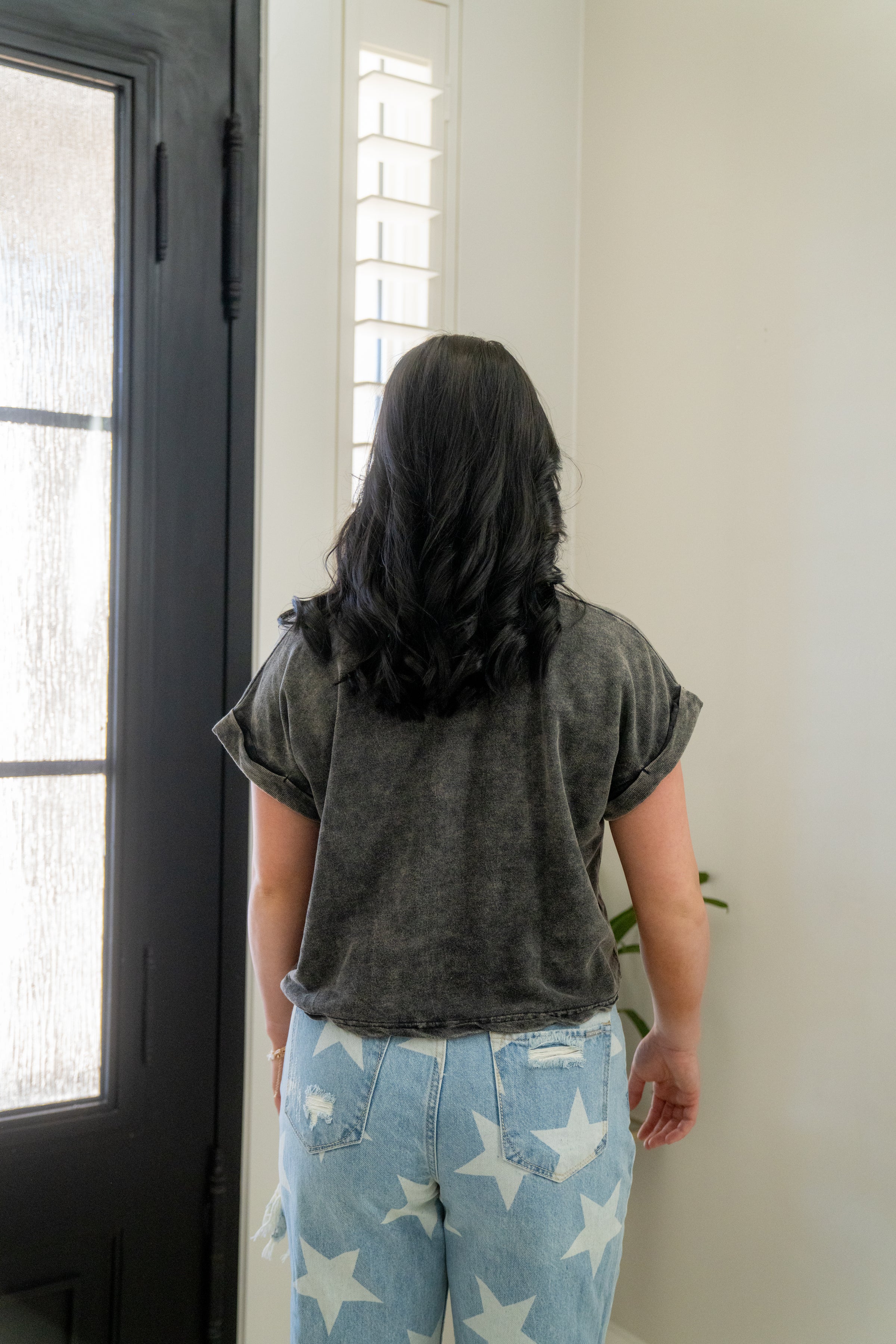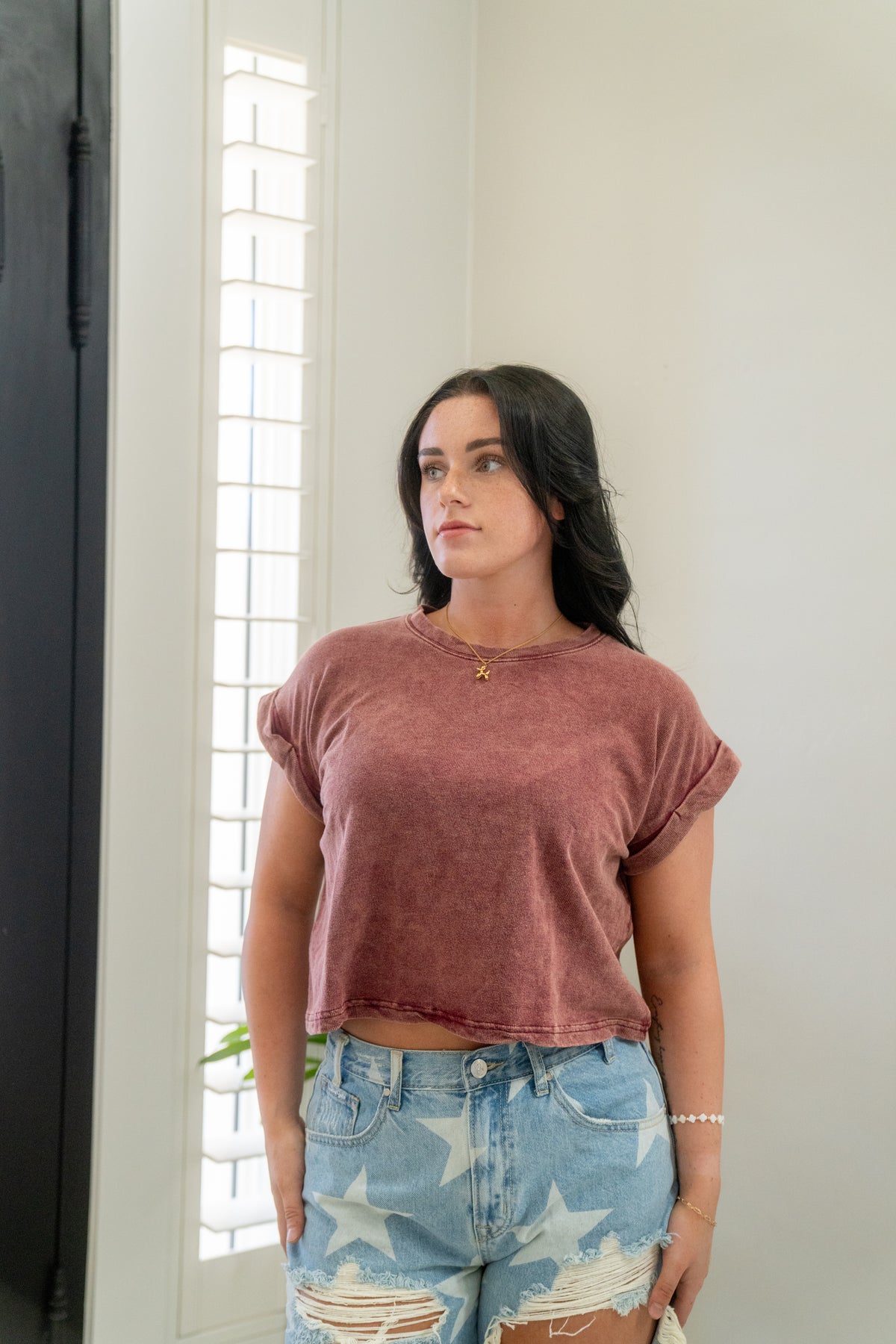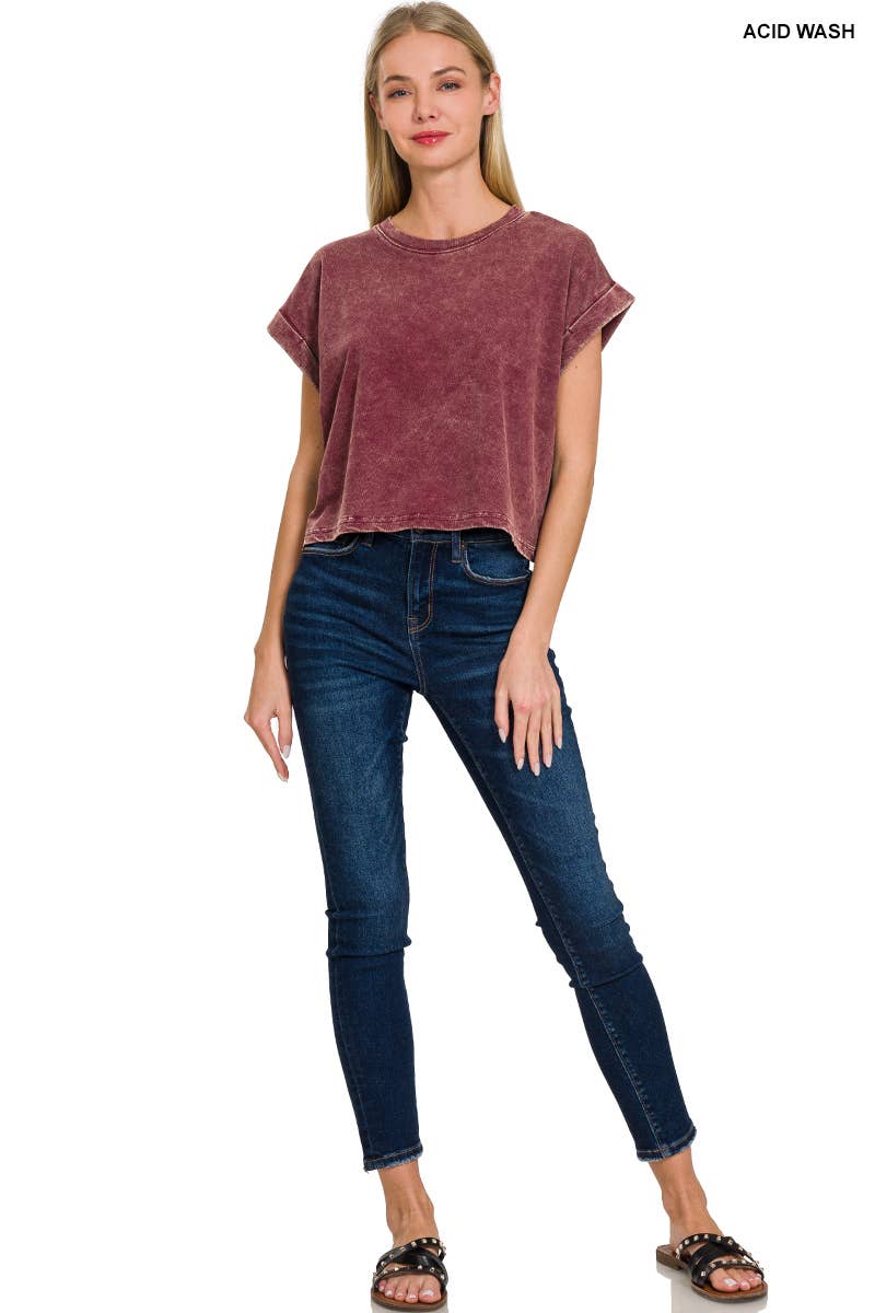 Expertly crafted with high-quality, 100% cotton, this Acid Wash Folded Sleeve Top showcases the perfect balance of comfort and durability. Made from top-grade cotton, this top sets the standard for excellent craftsmanship and superior quality.