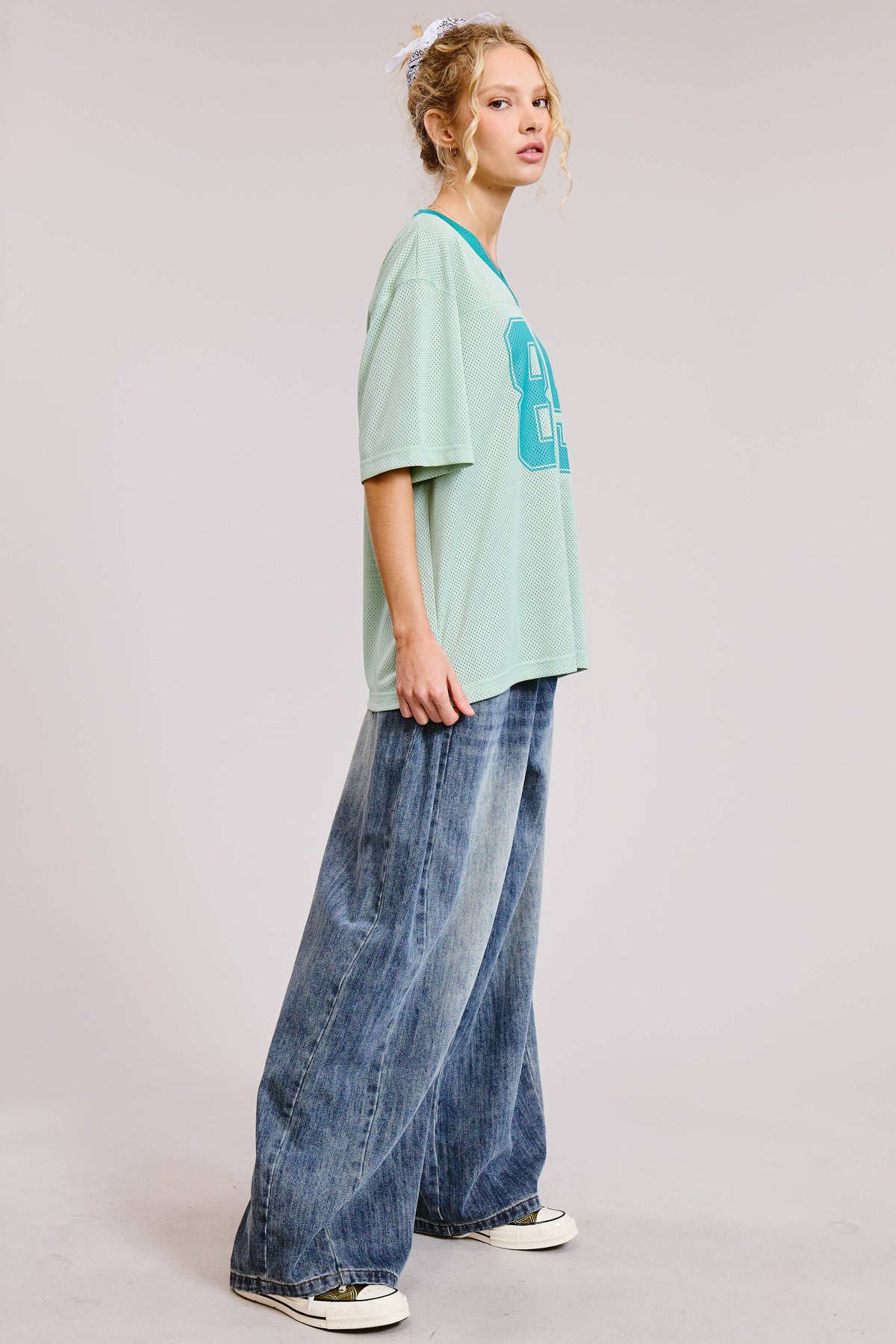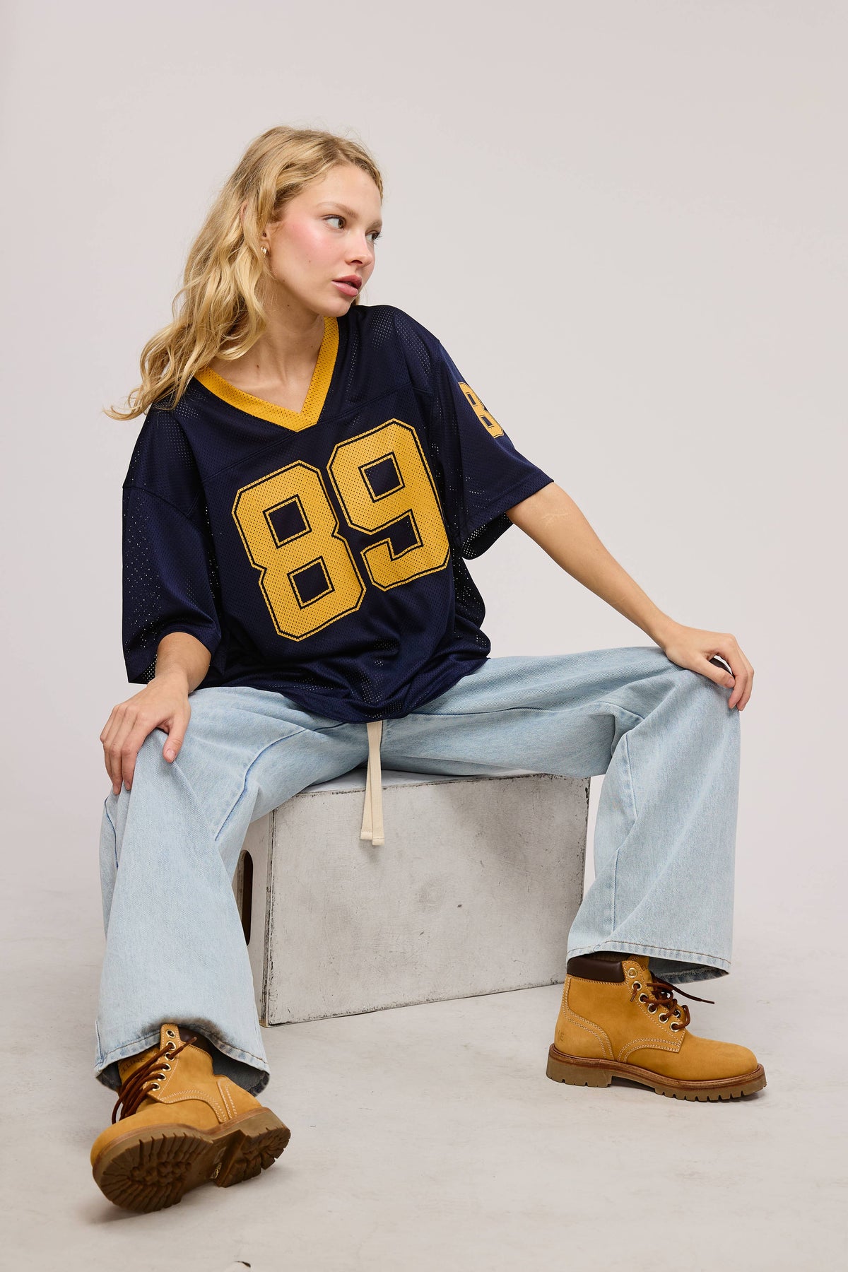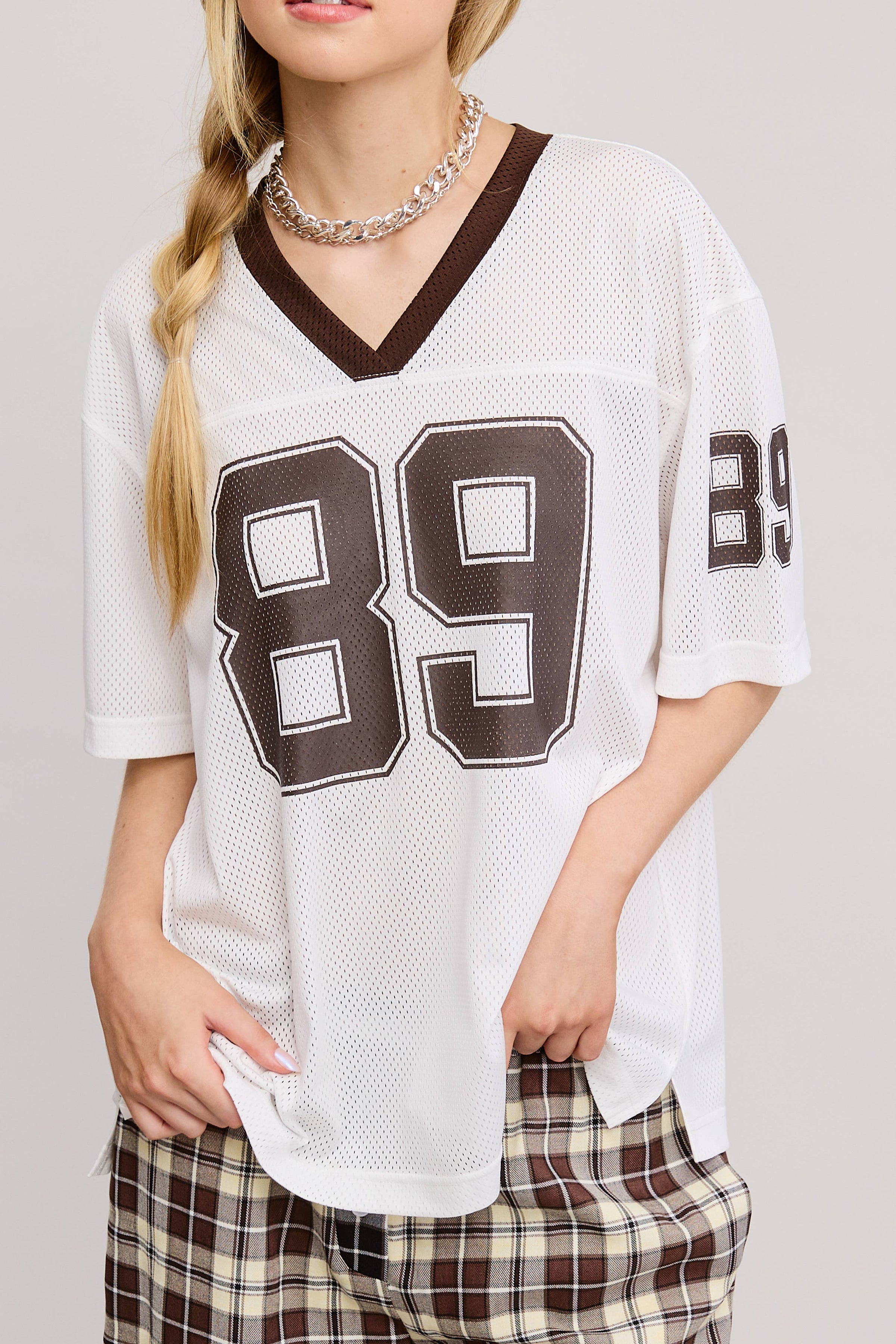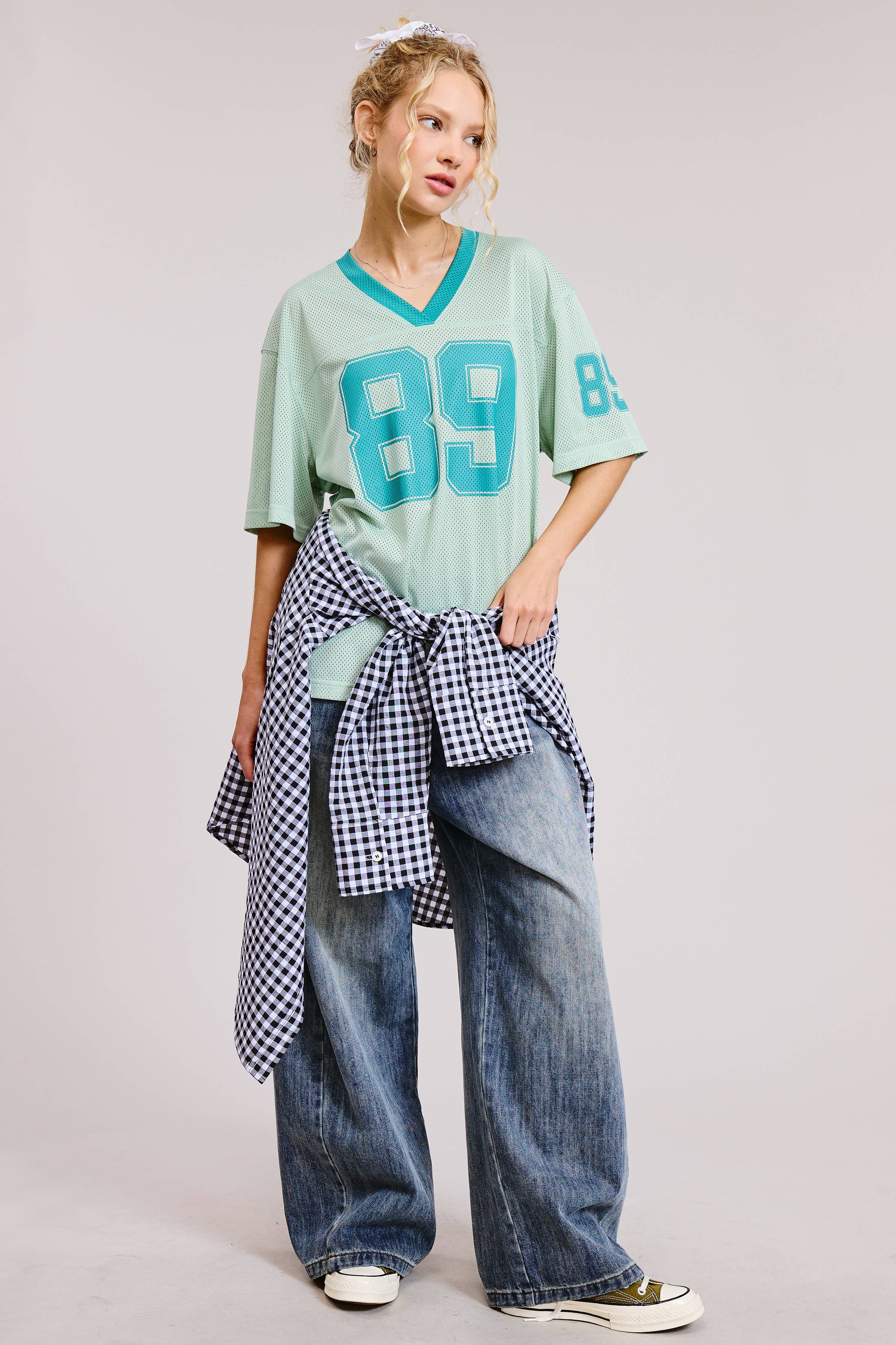 V-neck contrast short sleeve sporty jersey shirt top with lettered numbering "89" on front and left sleeve, oversized fit.