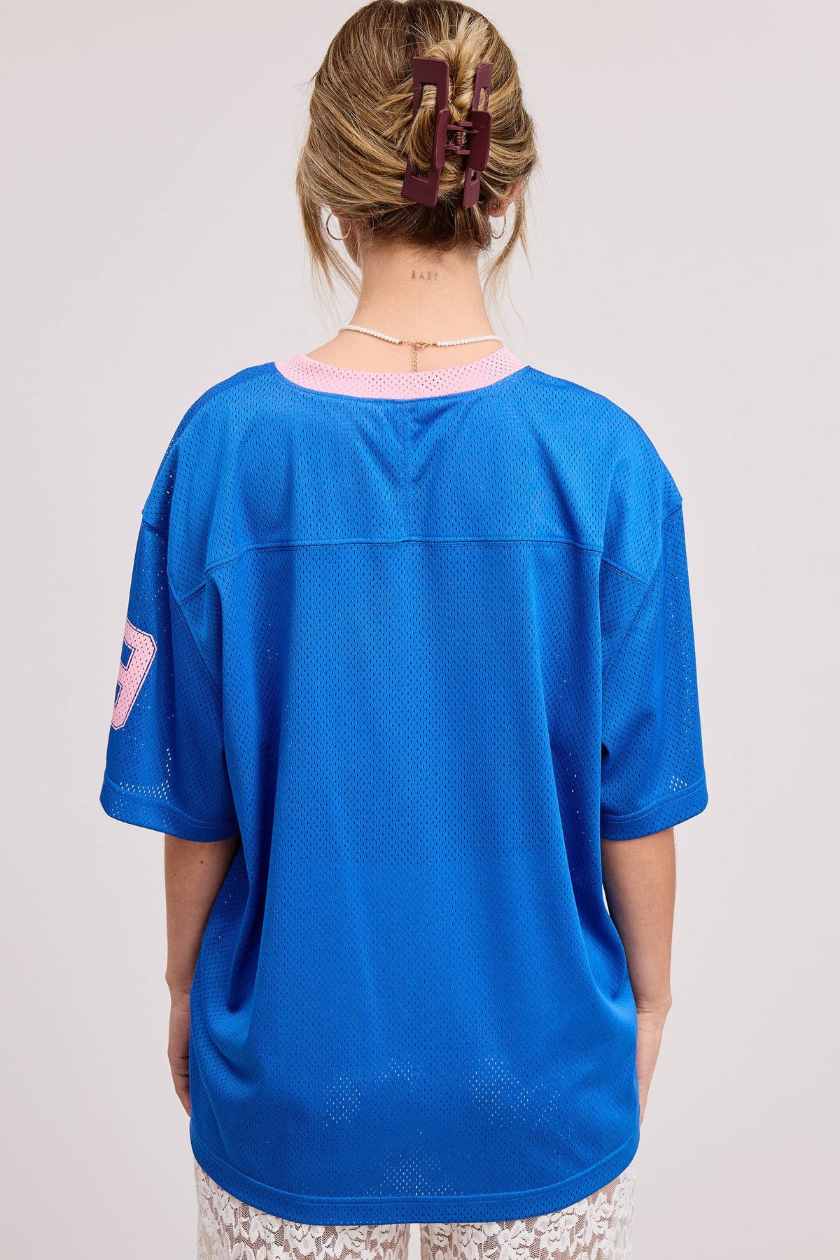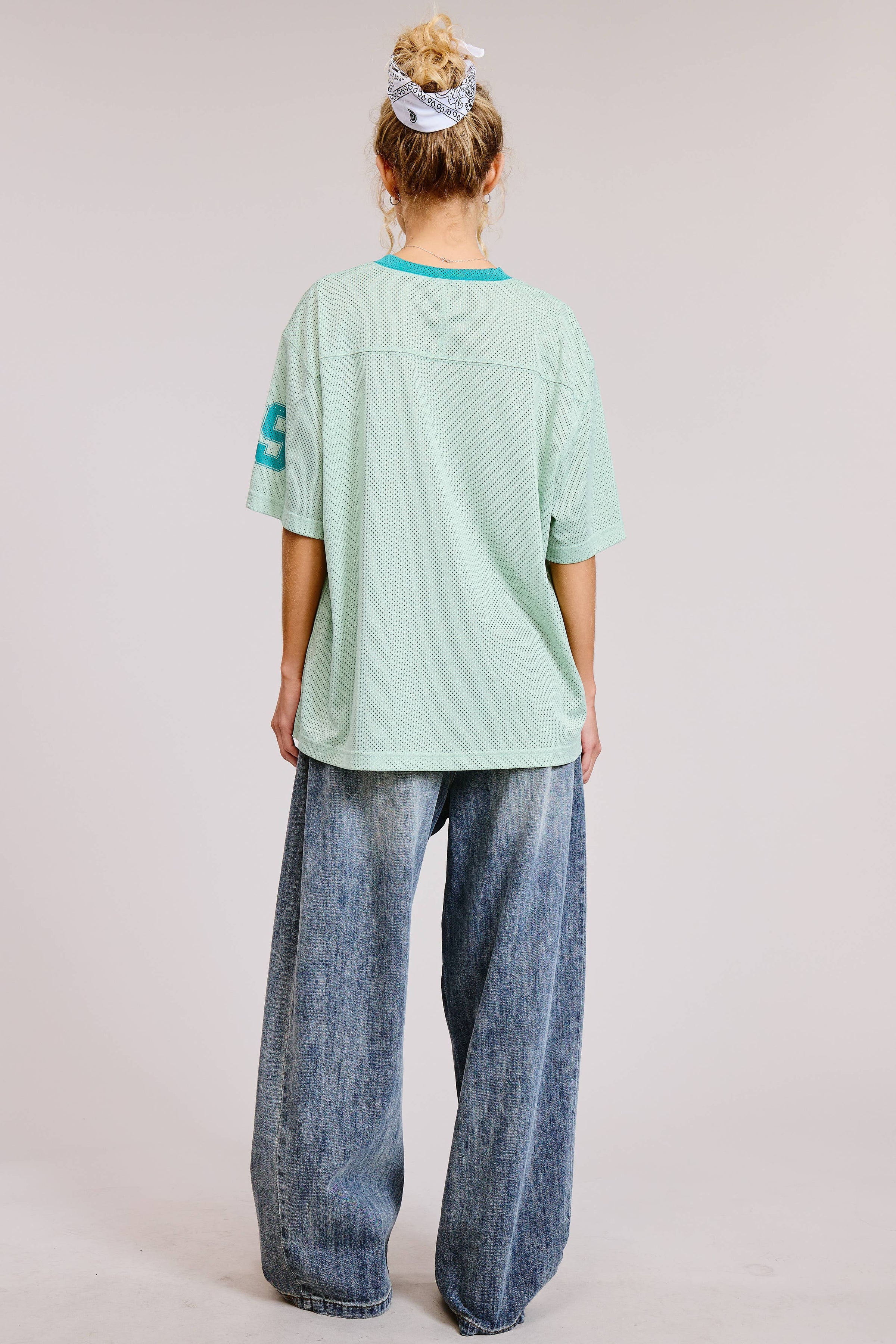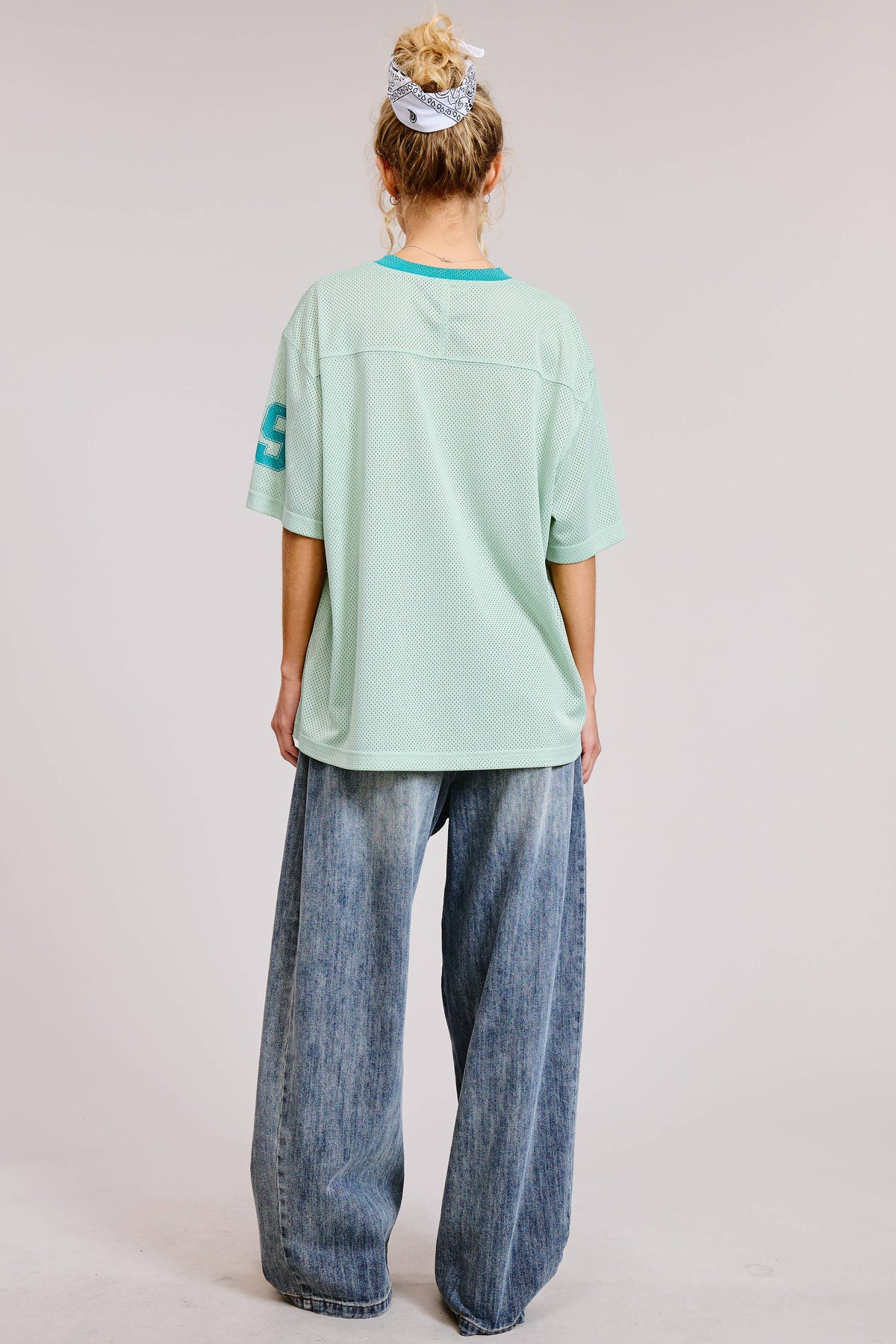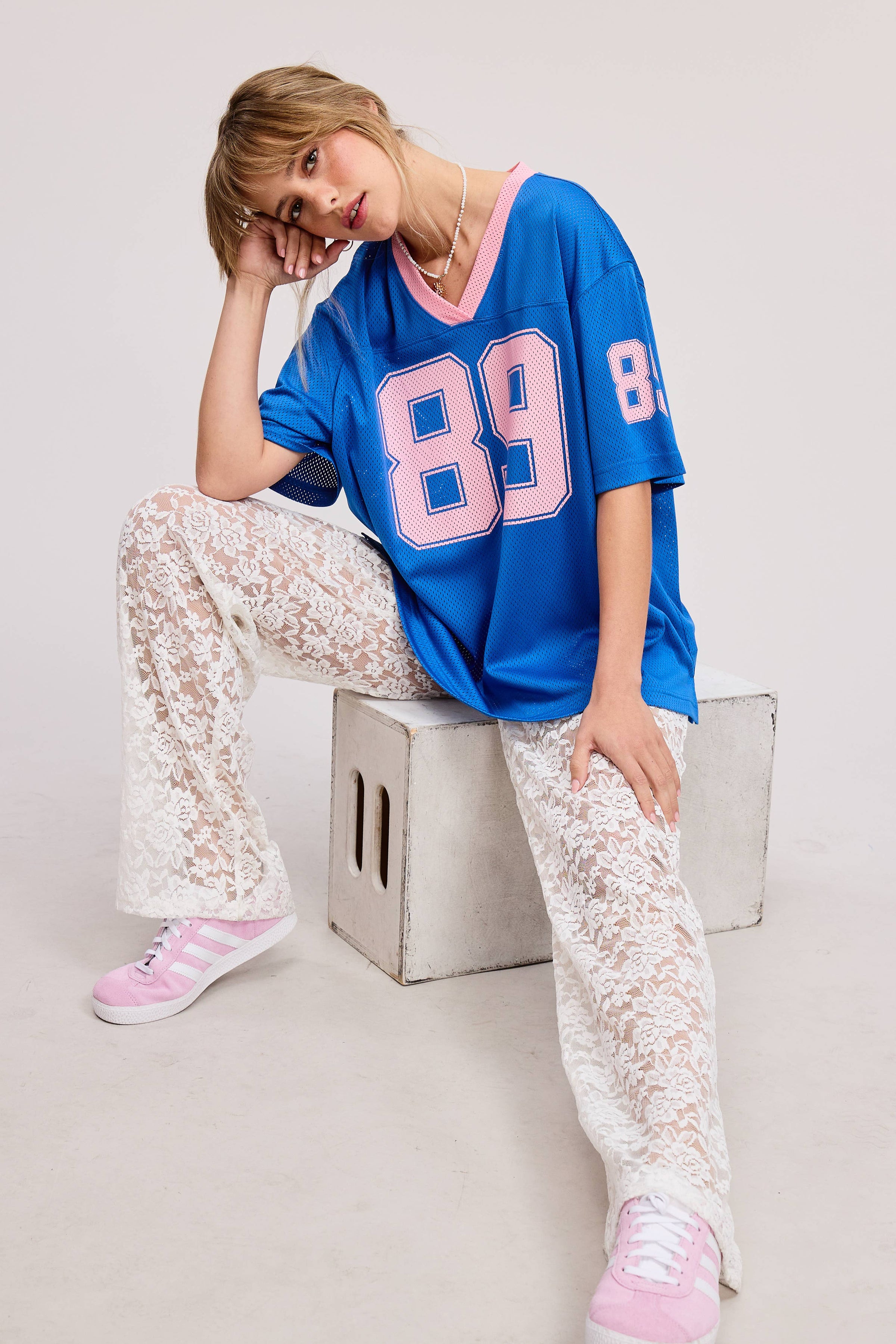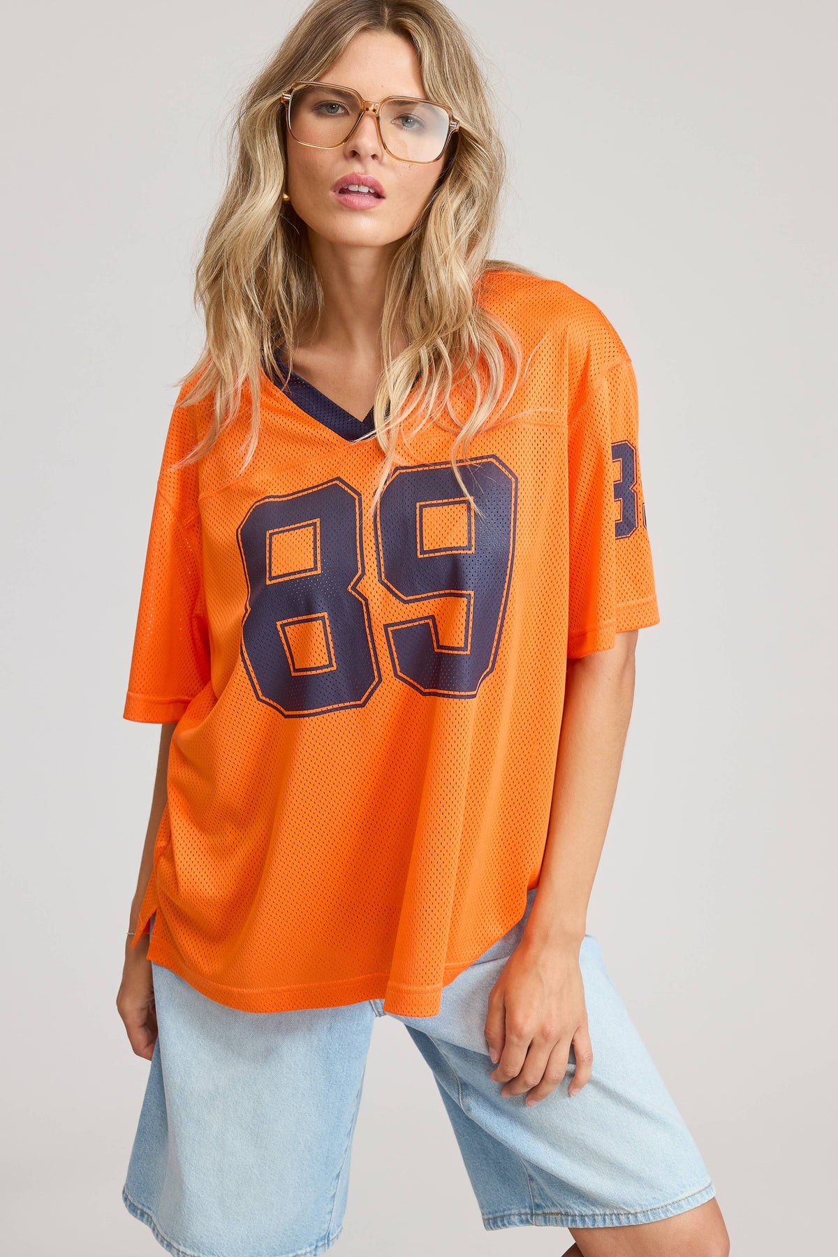 V-neck contrast short sleeve sporty jersey shirt top with lettered numbering "89" on front and left sleeve, oversized fit.