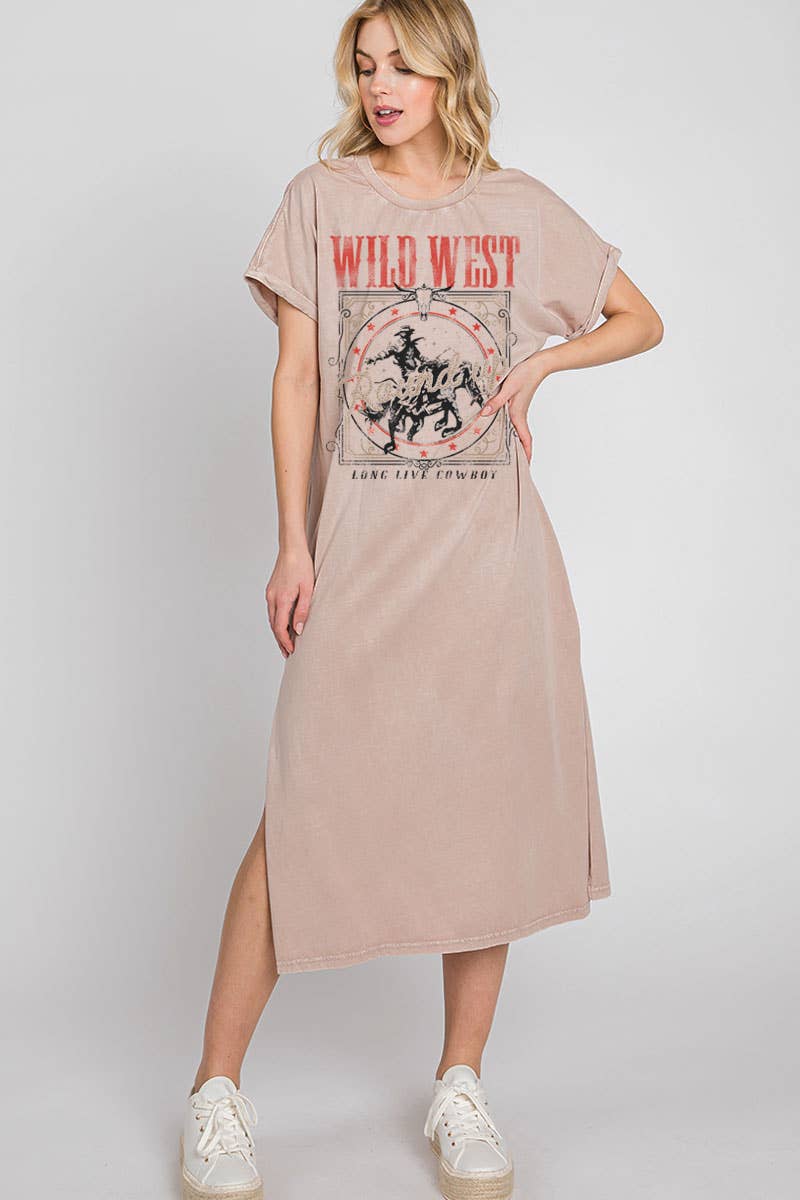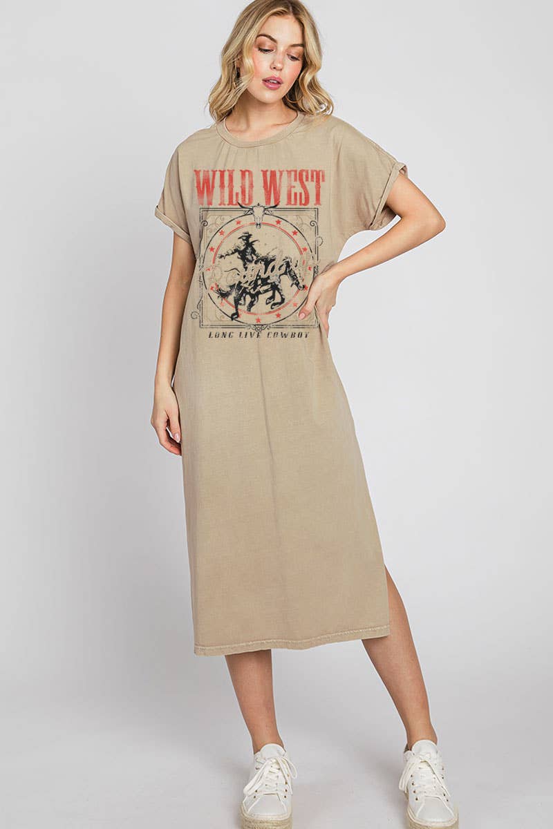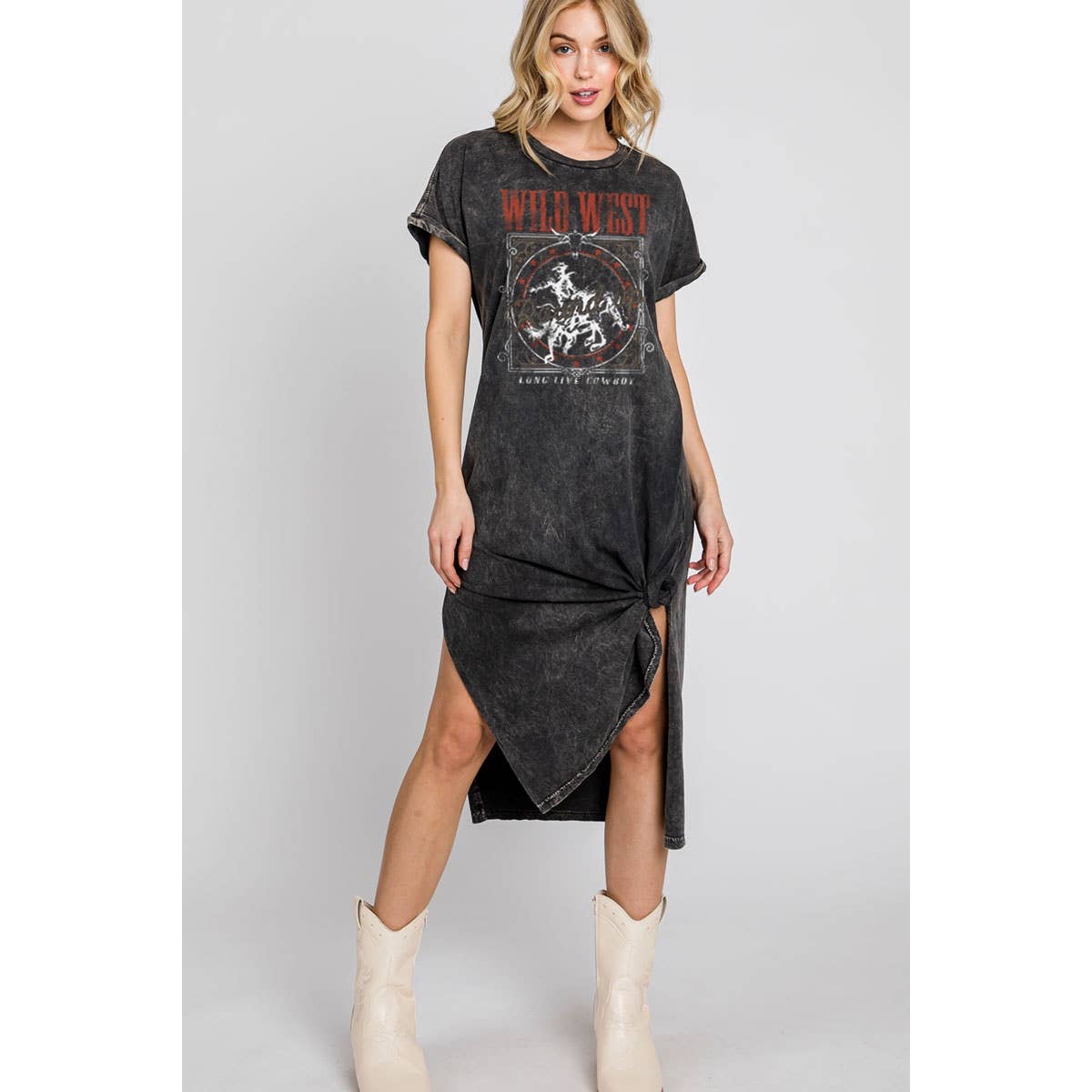 100% Cotton graphic knee length dress with an authentic vintage look and a softer feel that is only possible to achieve due to our special enzymes used to dye and mineral wash processes. Maxi t shirt dress with tacked sleeves & side slits