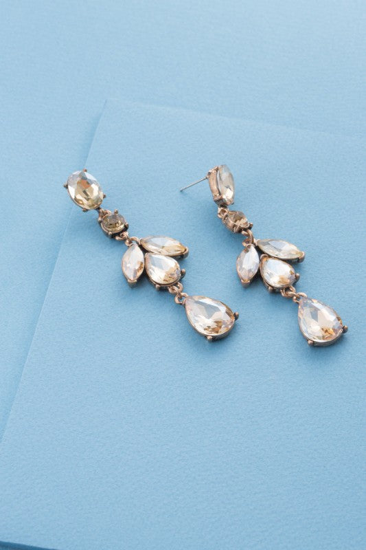 Long line dangling amber stone statement earrings. A beautiful iridescent style for an evening out.