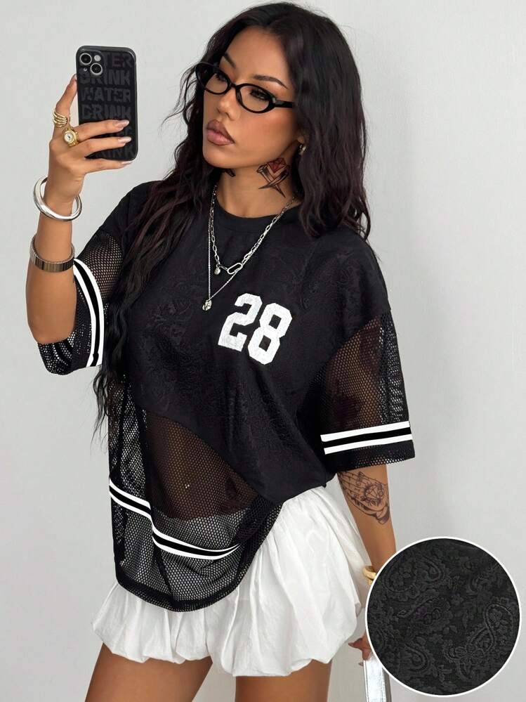 Score big style points with our playful Contrast Floral Mesh Black Jersey Number 28. The striking contrast design adds a fun twist to this jersey, making you stand out on and off the court. Make a statement with this unique jersey (and double meanings!).