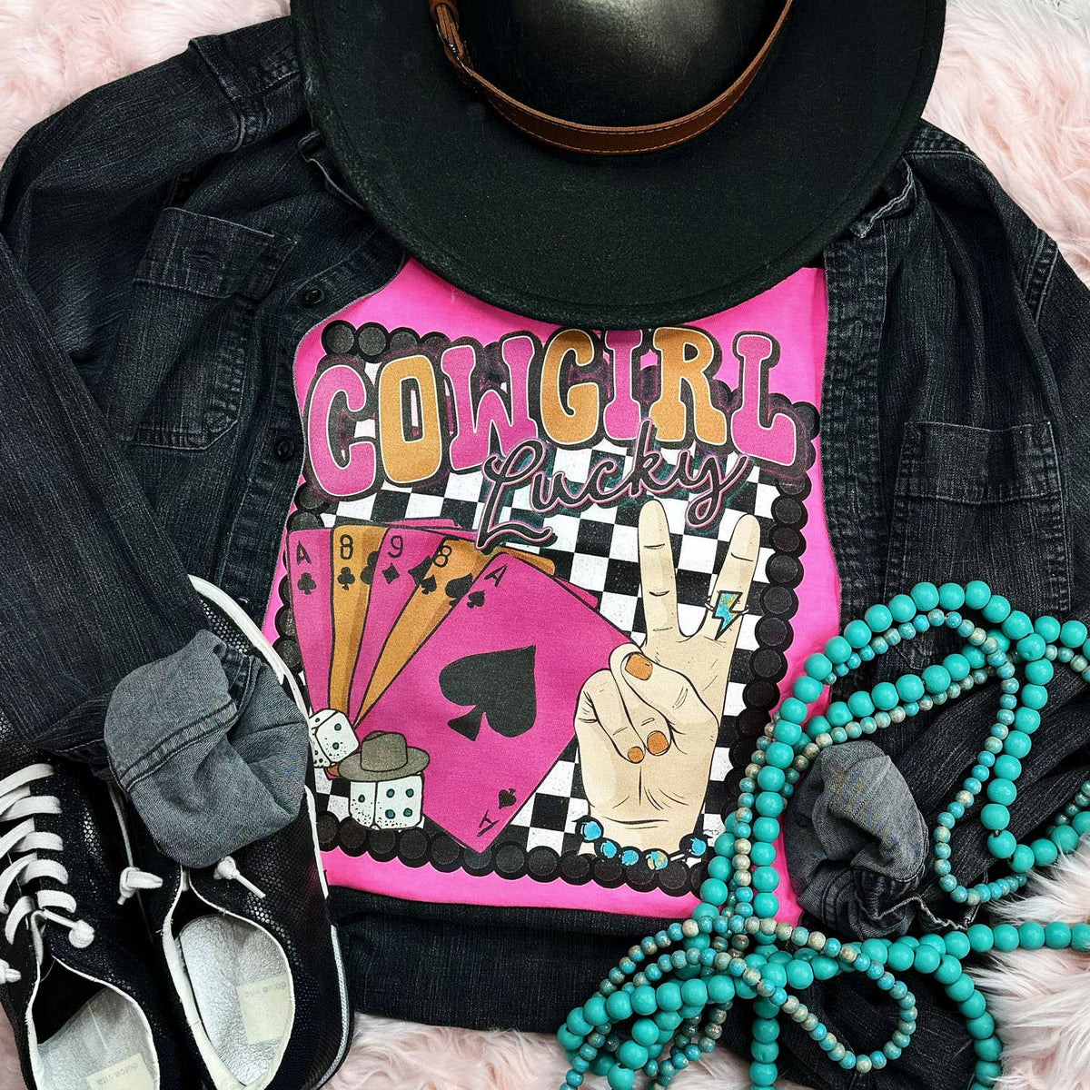 This “Cowgirl Lucky” design is made for the bold and the fearless. Featuring a retro checkerboard backdrop, lucky playing cards, dice, and a peace-sign hand decked in turquoise jewelry—this graphic is serving western Vegas glam with a side of sass. Whether she's headed to the rodeo, the casino, or just embracing her wild side, this one’s for the gals who know they make their own luck. A guaranteed favorite for boutique babes who love edgy cowgirl vibes and eye-catching colors.