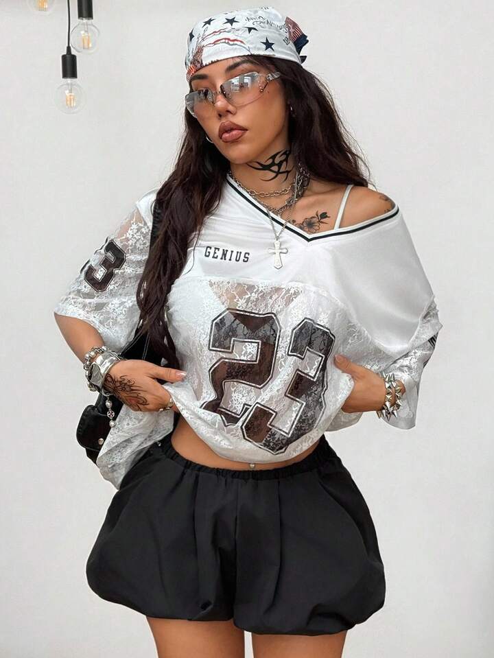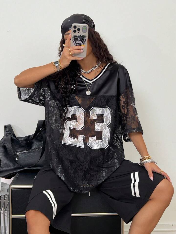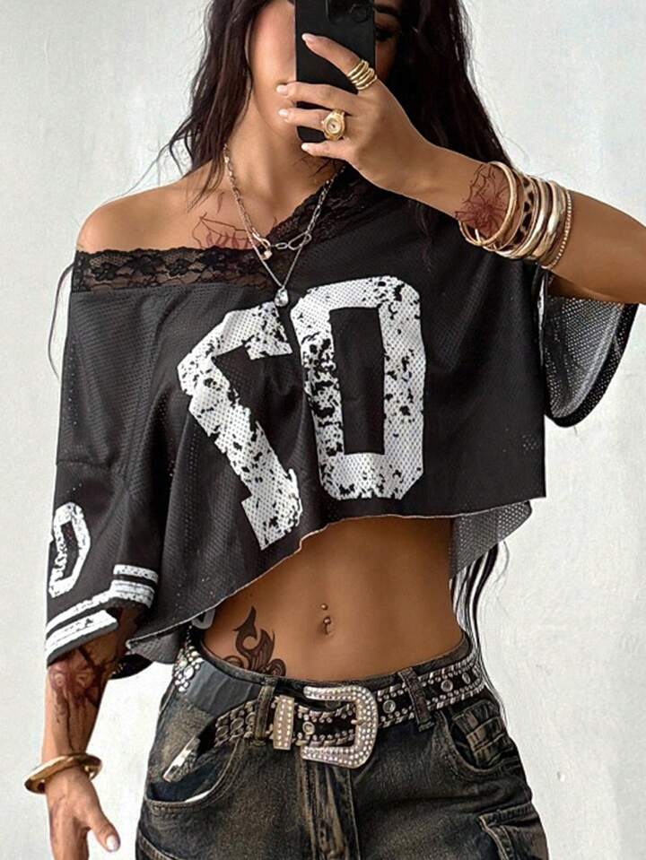 07 Black and White Lace Trim Mesh Crop Top Jersey