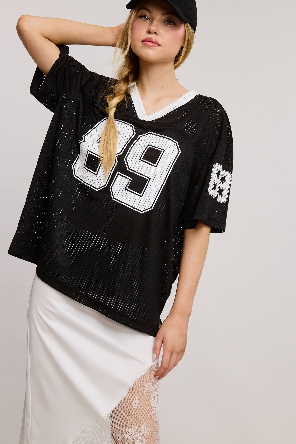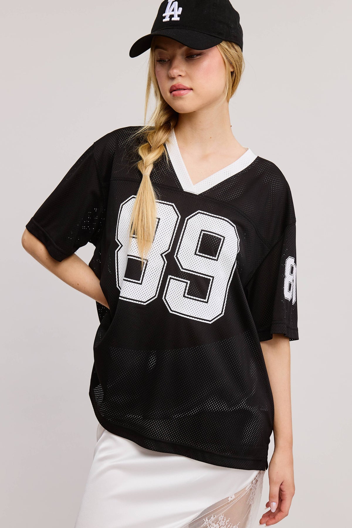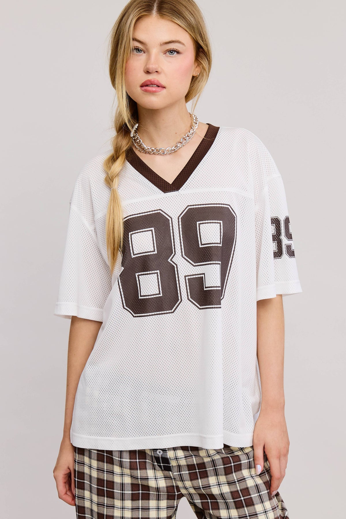 V-neck contrast short sleeve sporty jersey shirt top with lettered numbering "89" on front and left sleeve, oversized fit.