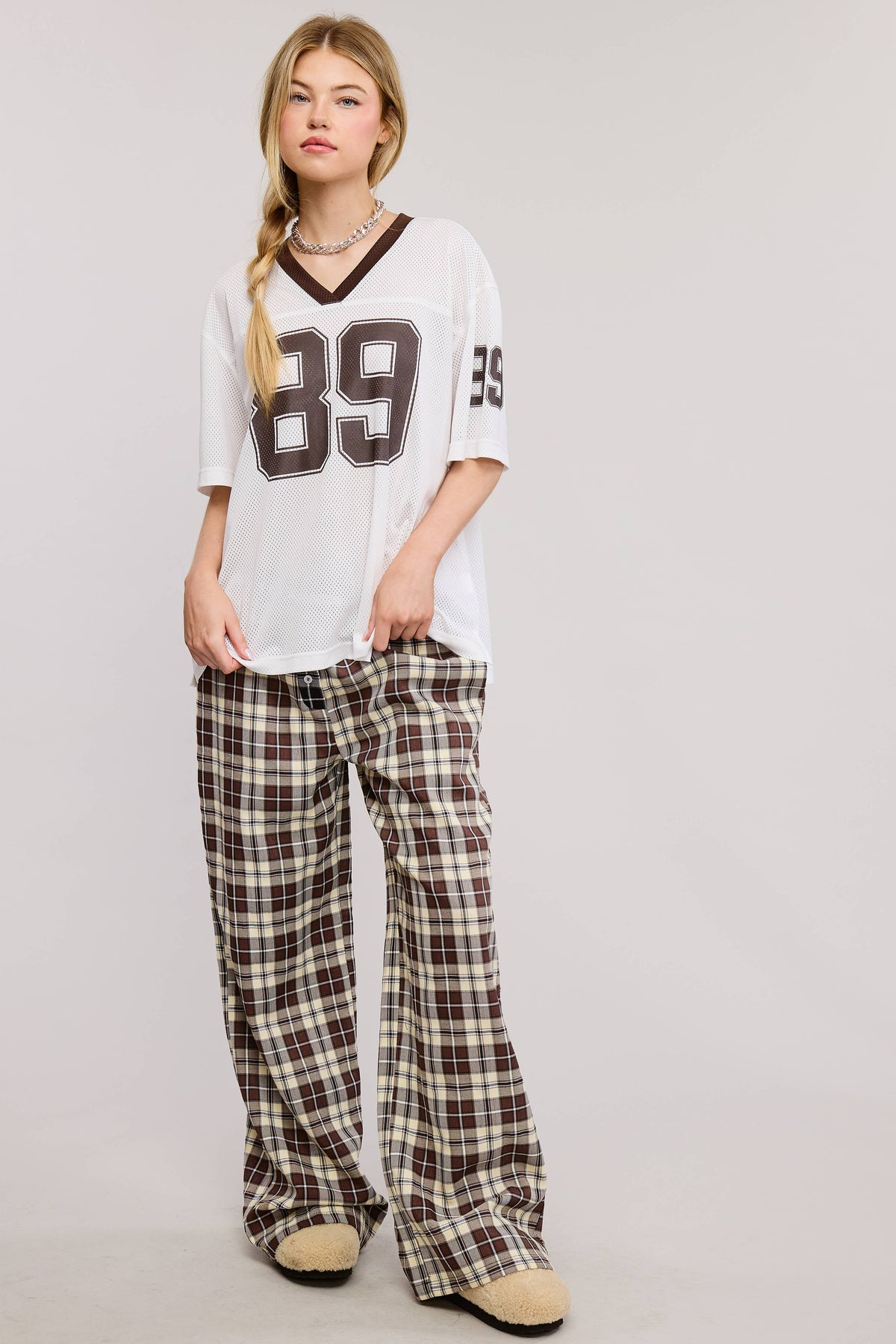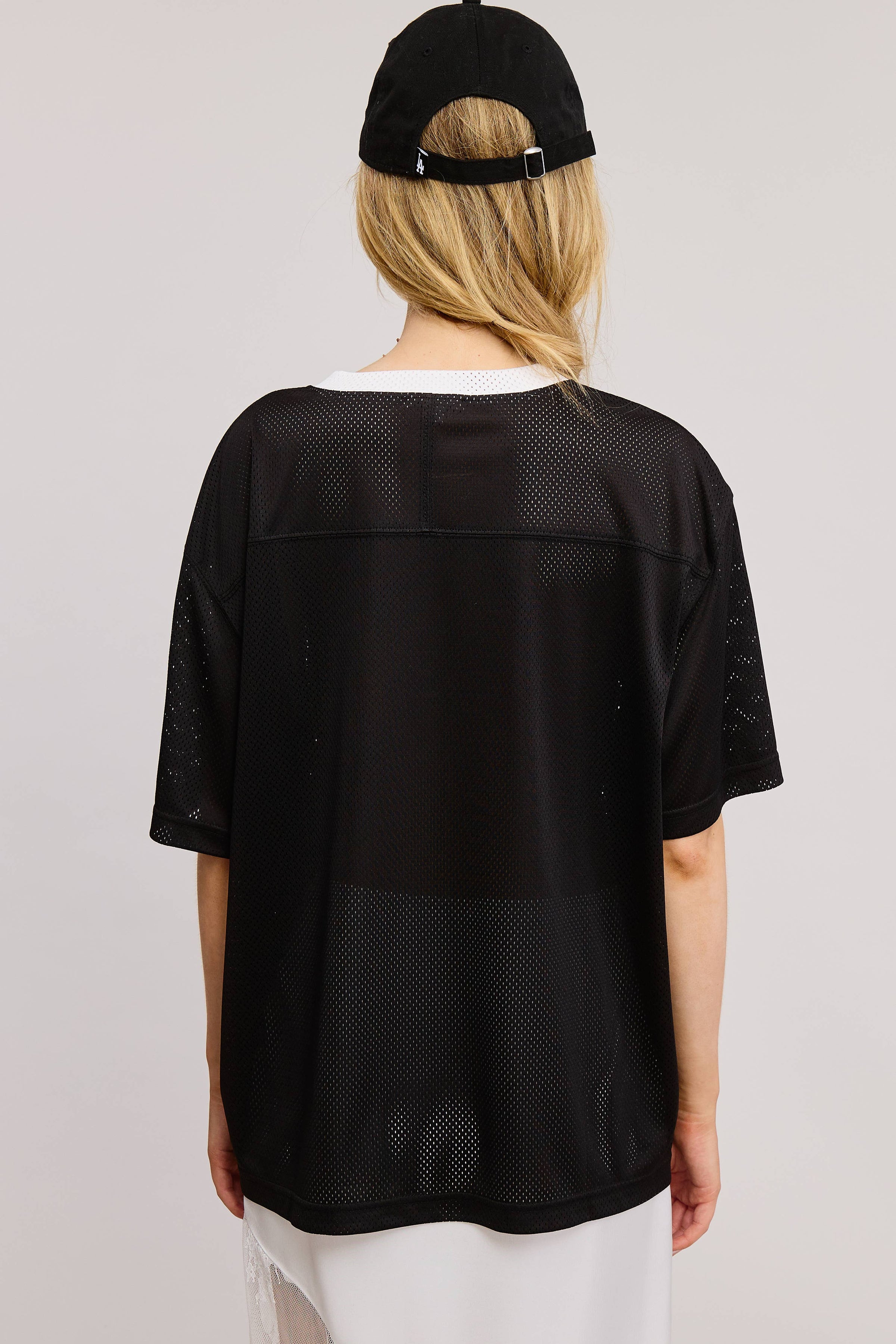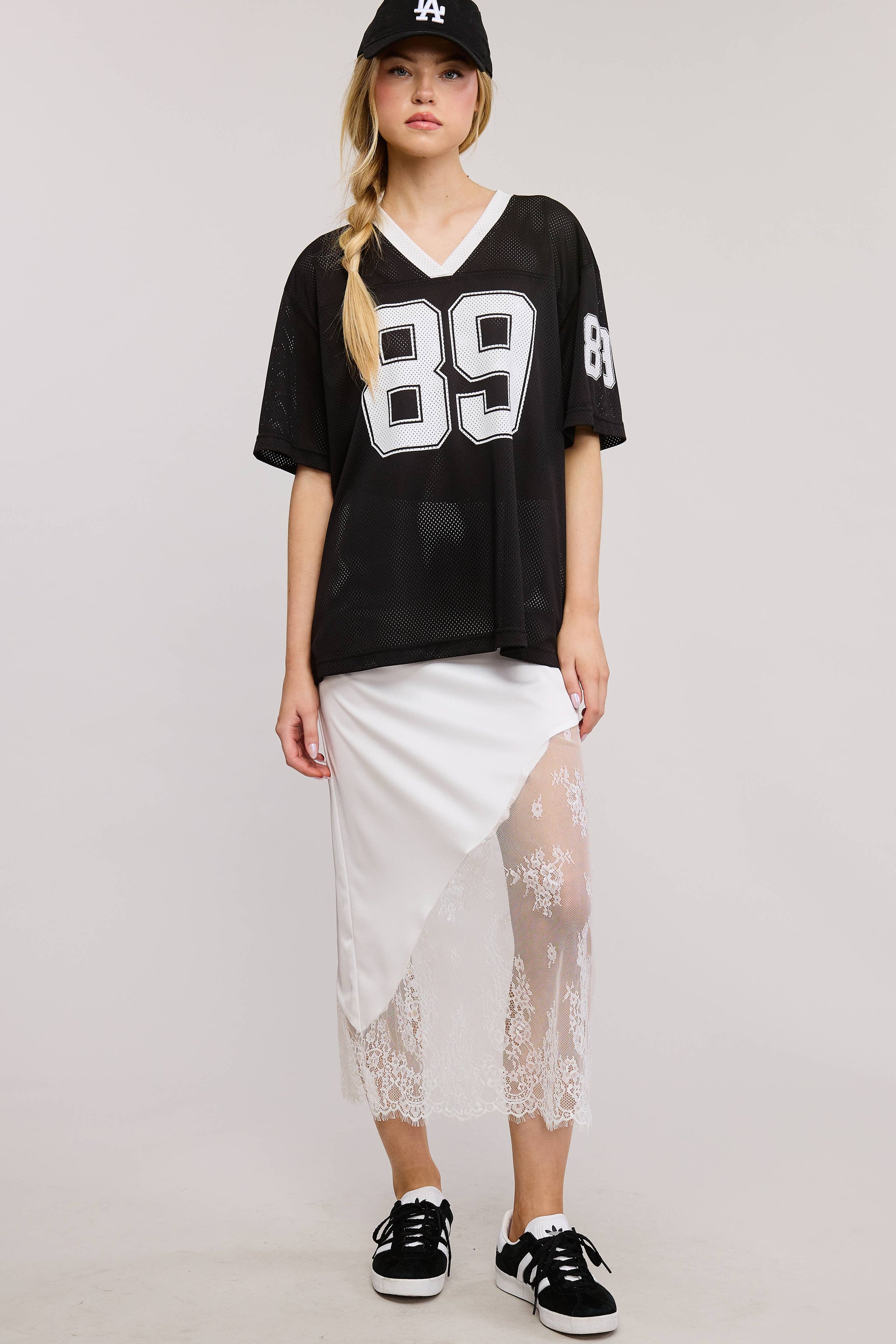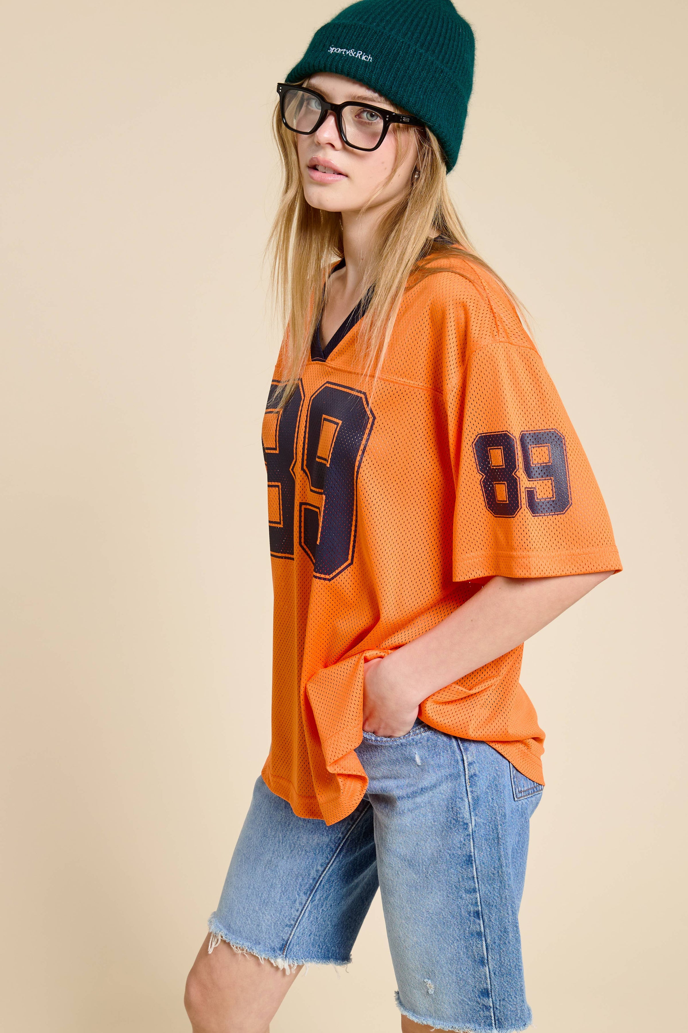 V-neck contrast short sleeve sporty jersey shirt top with lettered numbering "89" on front and left sleeve, oversized fit.